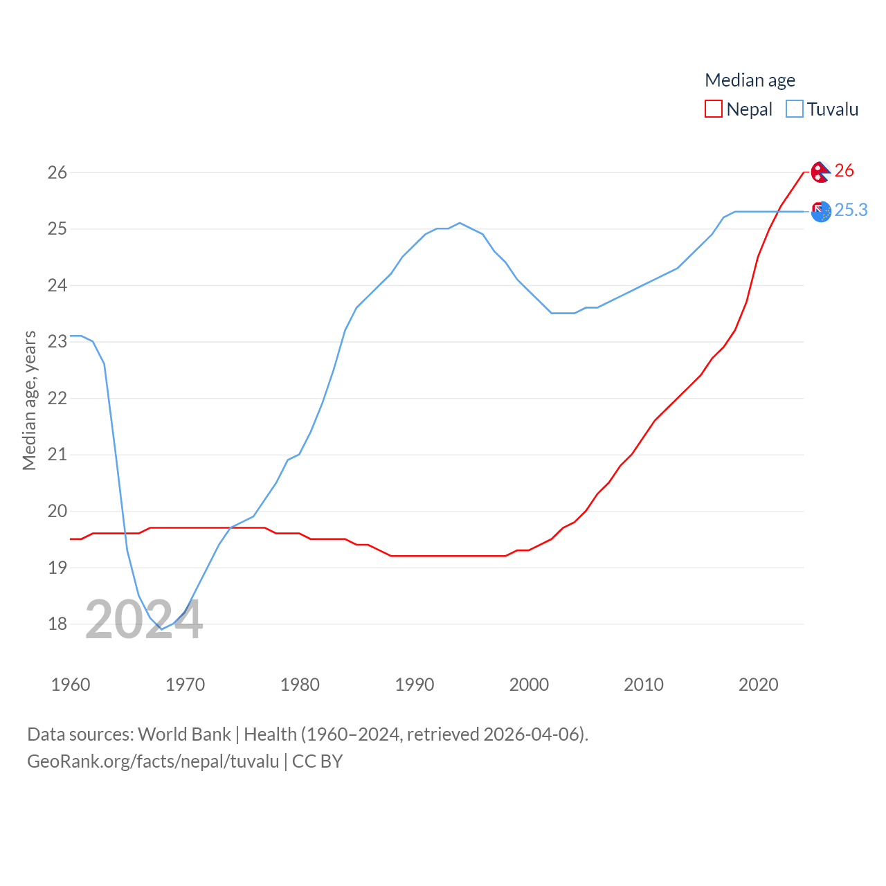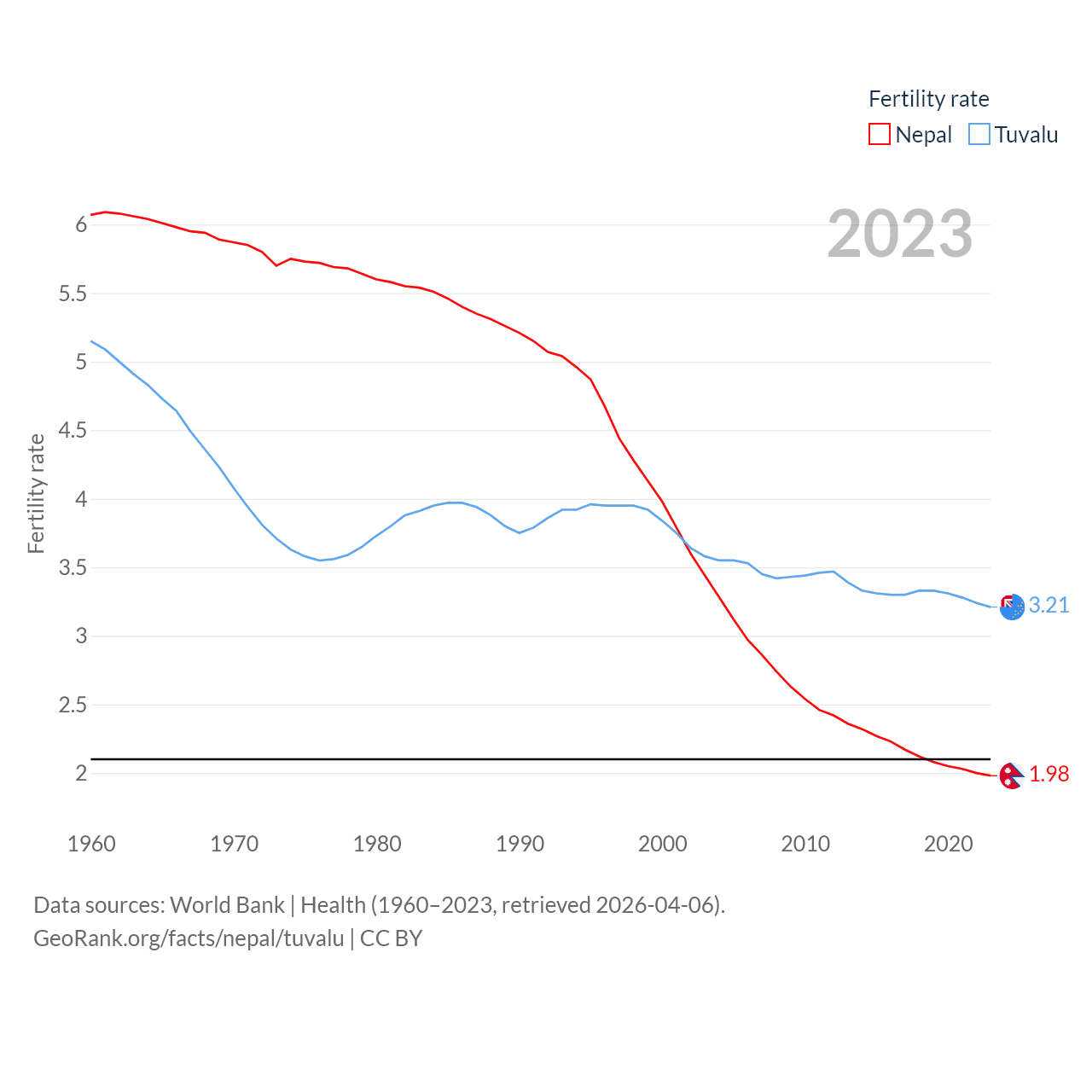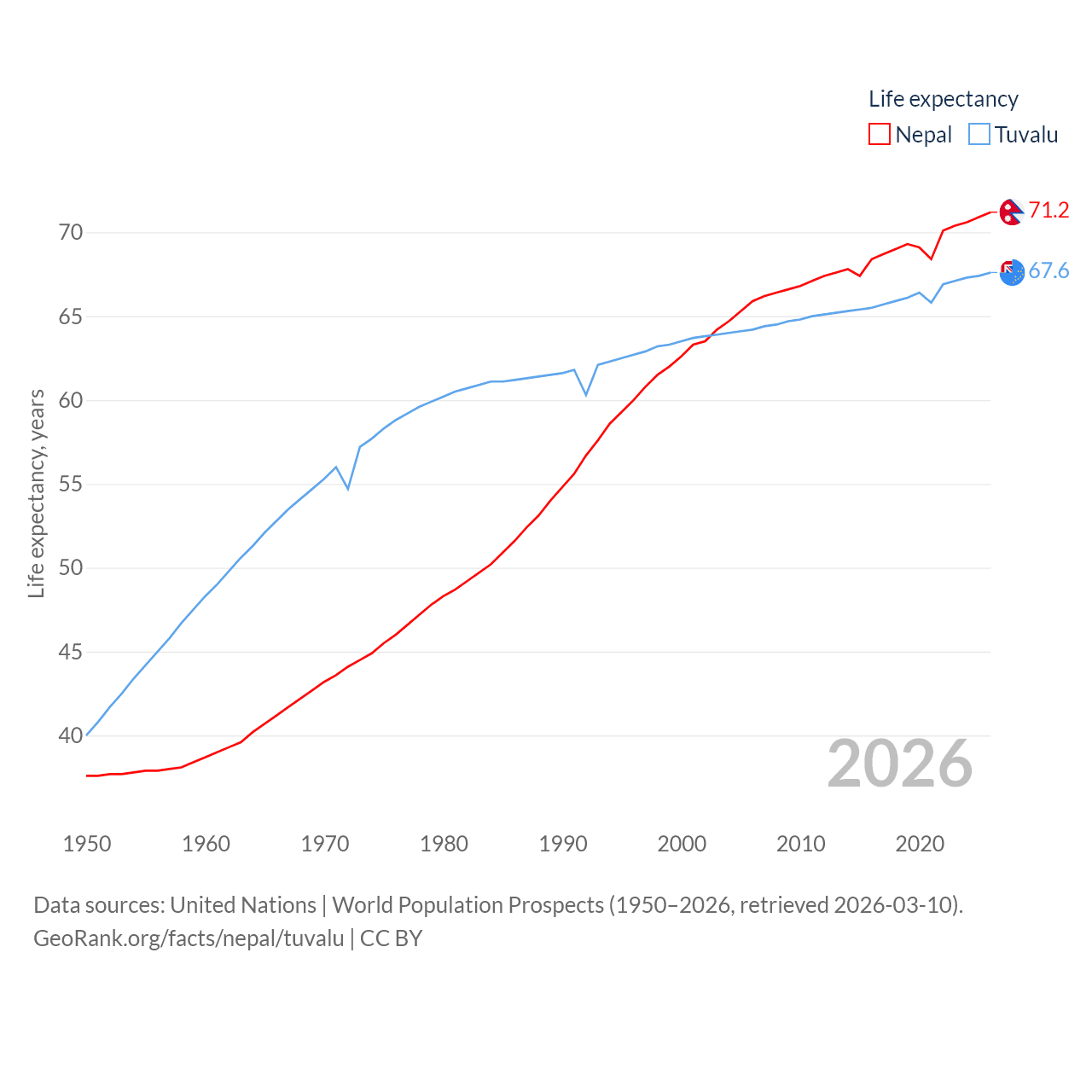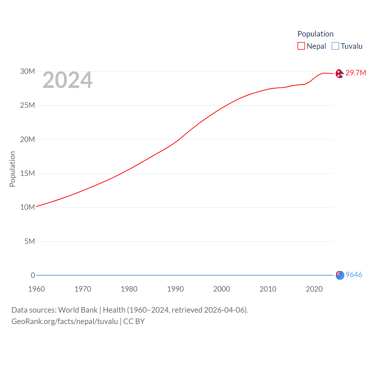 Nepal has a population of 29.7M (ranked 51/197), compared with 9.65K in Tuvalu (ranked 196/197). Nepal's land area is 55,348 sq mi versus 11.6 sq mi for Tuvalu (ranked 92nd vs. 194th).