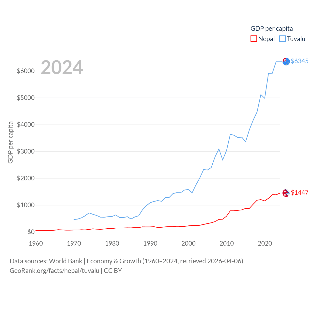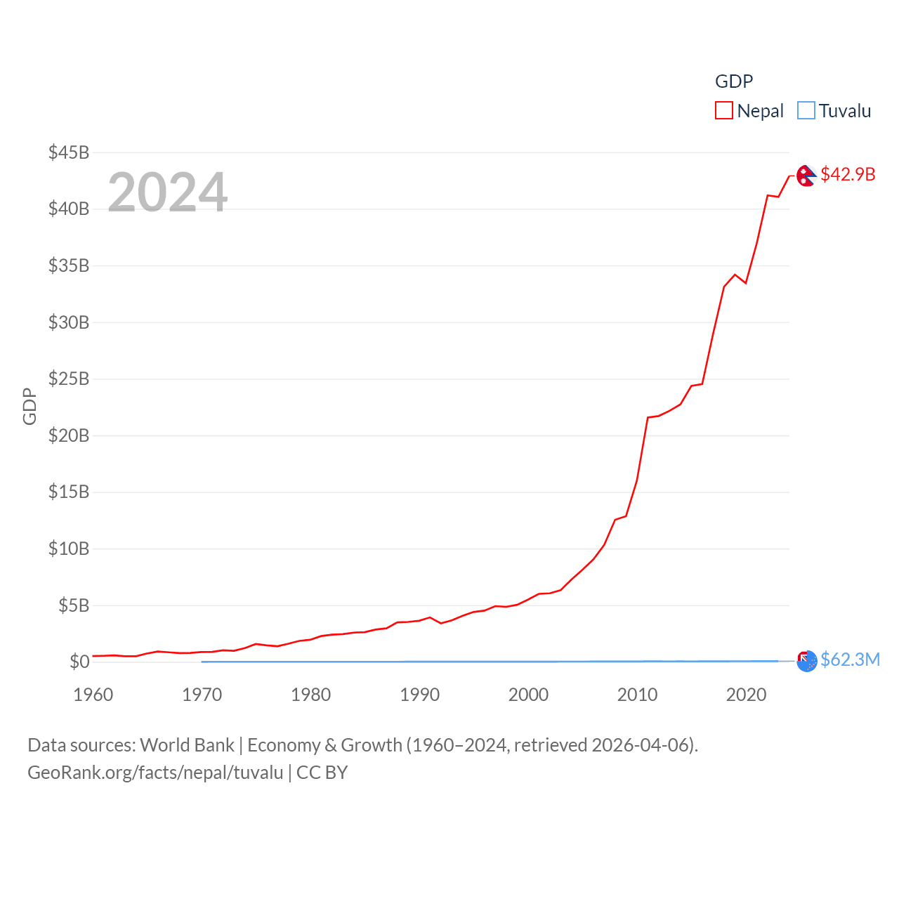 By GDP, Nepal ranks 101/197 ($42.9B) and Tuvalu ranks 196/197 ($62.3M). By GDP per capita, Nepal ranks 164/197 ($1,447), while Tuvalu ranks 110/197 ($6,345).