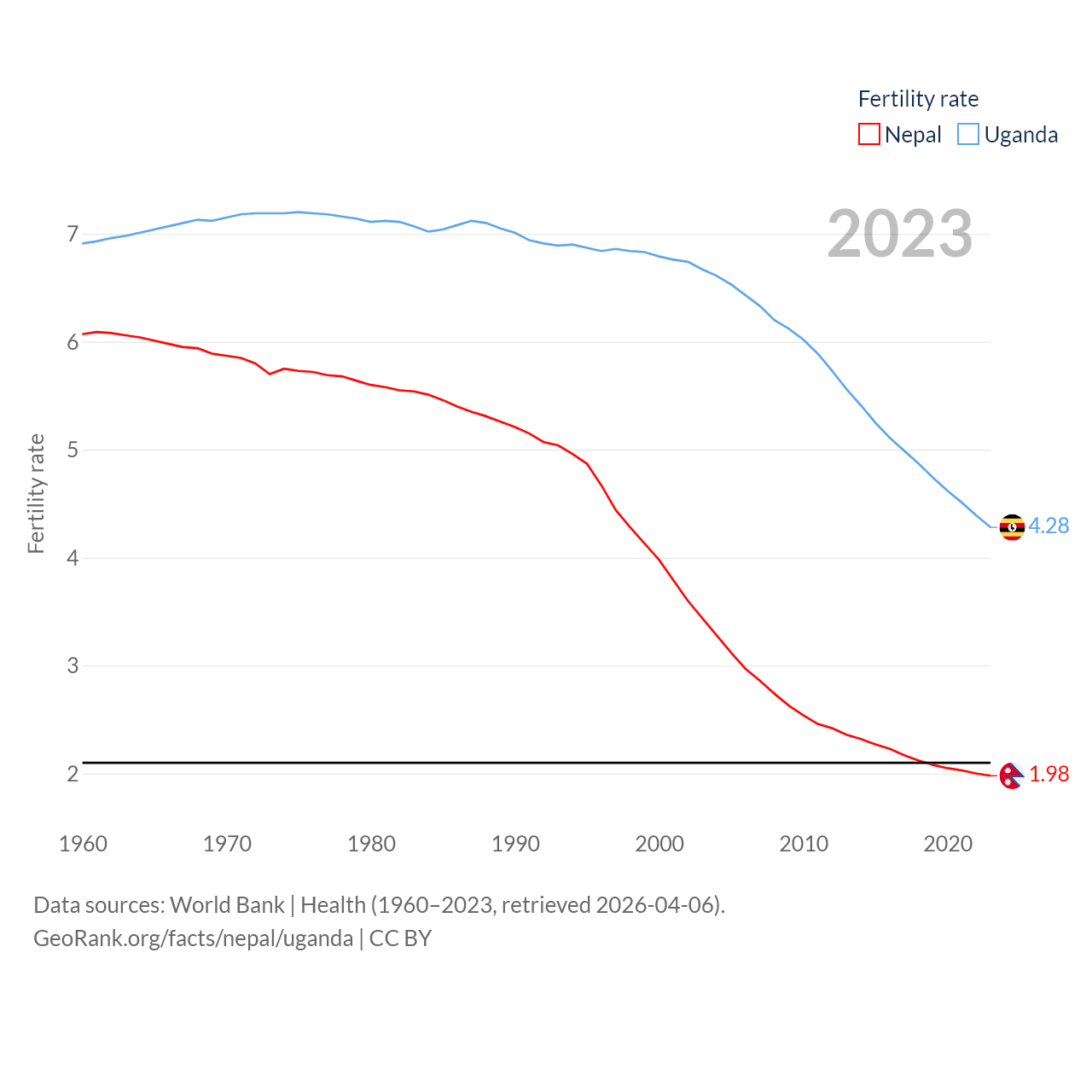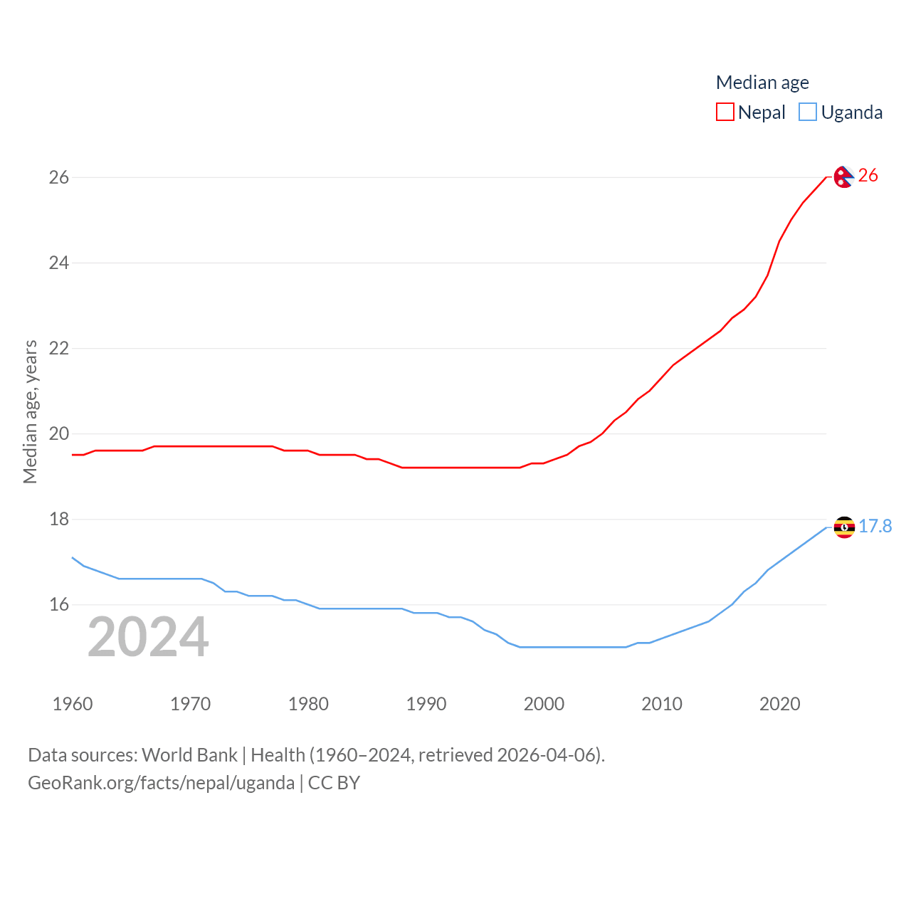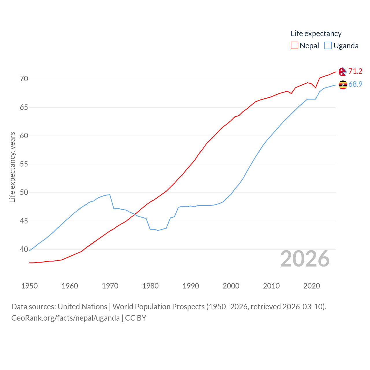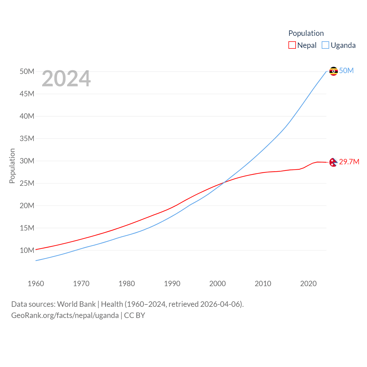 Nepal has a population of 29.7M (ranked 51/197), compared with 50M in Uganda (ranked 31/197). Nepal's land area is 55,348 sq mi versus 77,421 sq mi for Uganda (ranked 92nd vs. 84th).