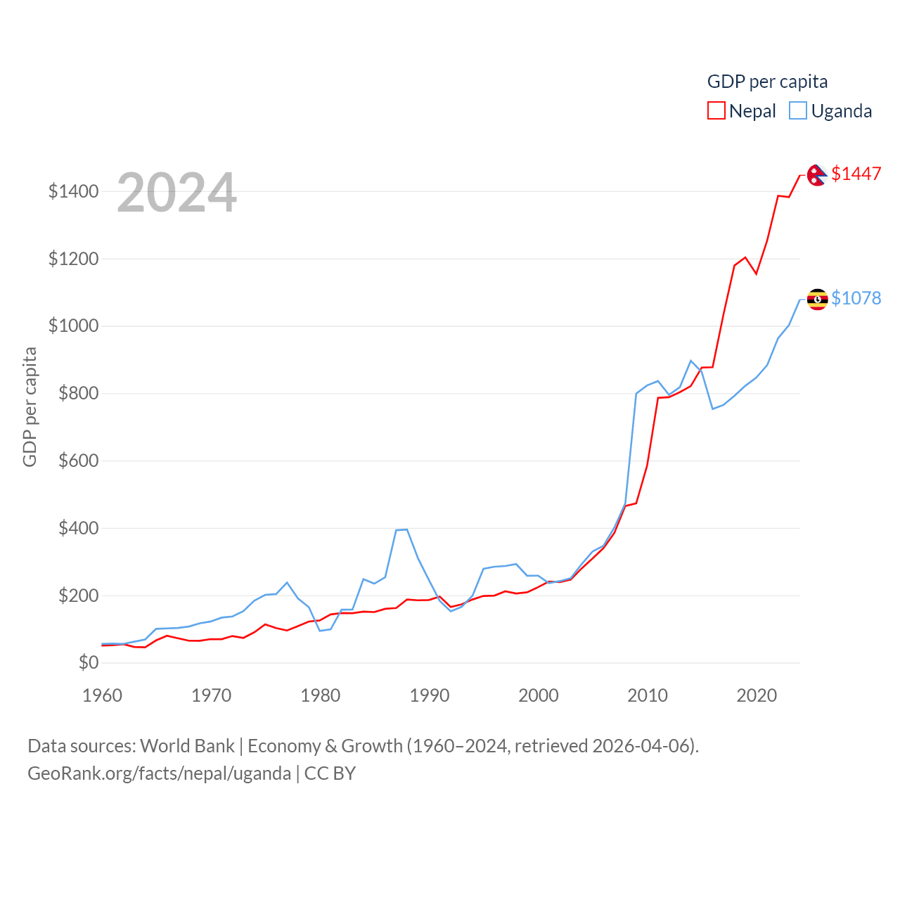 By GDP, Nepal ranks 101/197 ($42.9B) and Uganda ranks 89/197 ($53.9B). By GDP per capita, Nepal ranks 164/197 ($1,447), while Uganda ranks 176/197 ($1,078).
