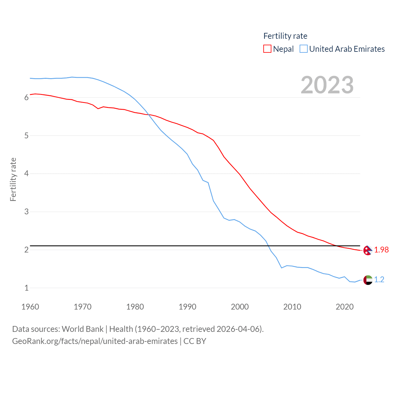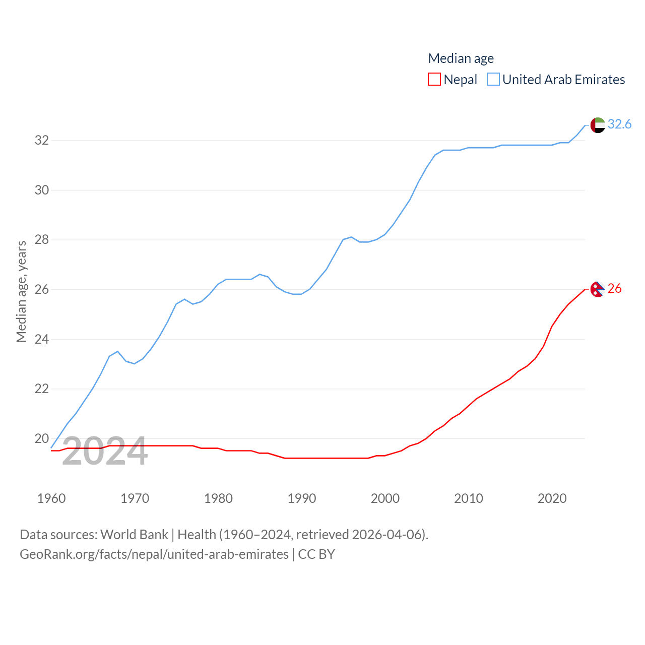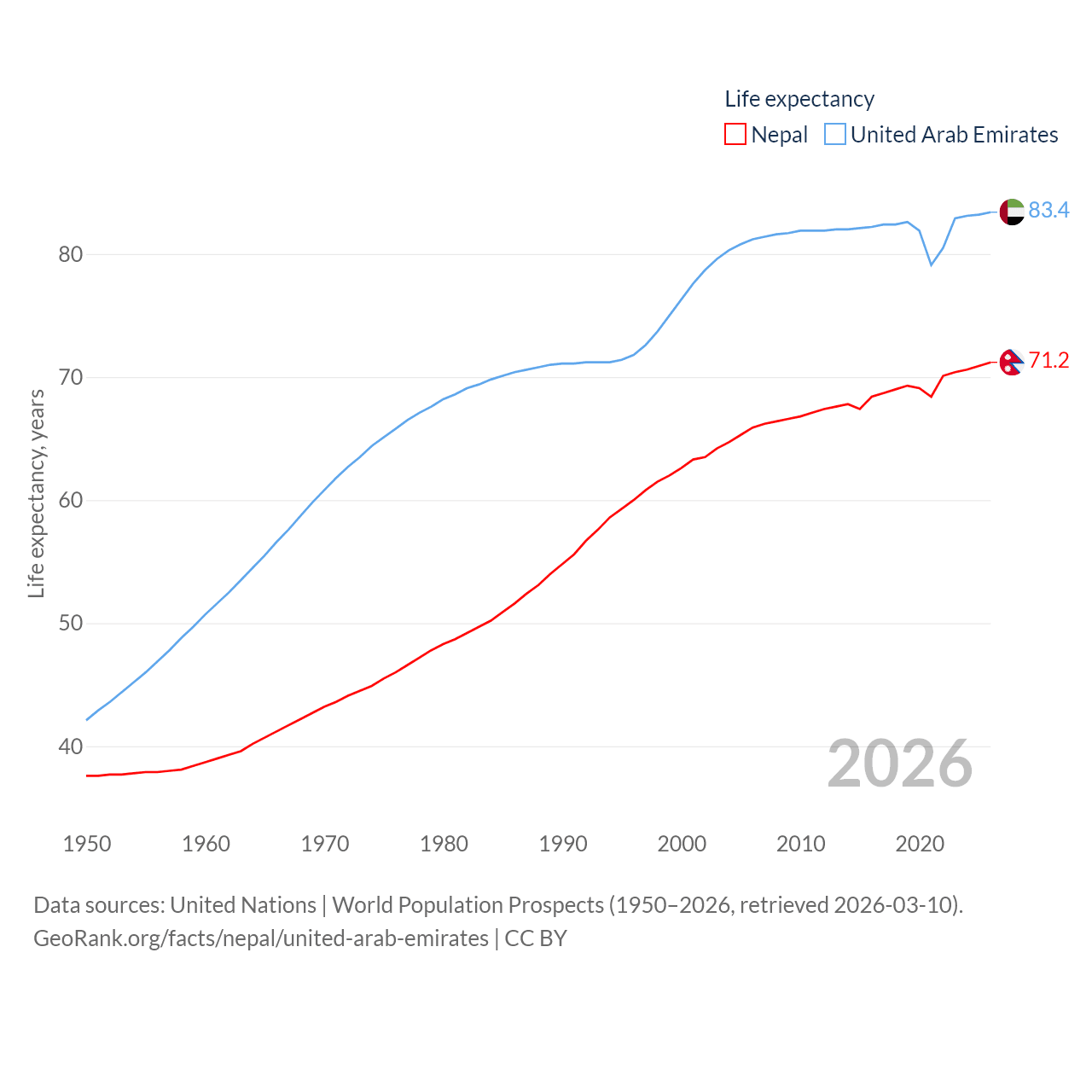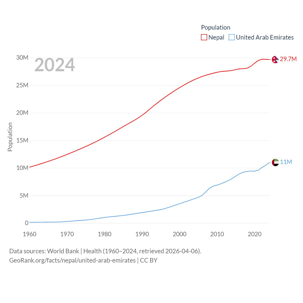Nepal has a population of 29.7M (ranked 51/197), compared with 11M in The United Arab Emirates (ranked 86/197). Nepal's land area is 55,348 sq mi versus 27,421 sq mi for The United Arab Emirates (ranked 92nd vs. 117th).