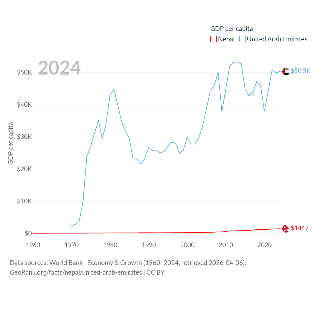 By GDP, Nepal ranks 101/197 ($42.9B) and The United Arab Emirates ranks 27/197 ($552B). By GDP per capita, Nepal ranks 164/197 ($1,447), while The United Arab Emirates ranks 24/197 ($50,274).