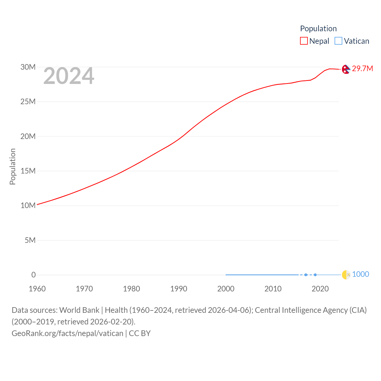 Nepal has a population of 29.7M (ranked 51/197), compared with 1K in The Vatican (ranked 197/197). Nepal's land area is 55,348 sq mi versus 0.17 sq mi for The Vatican (ranked 92nd vs. 197th).