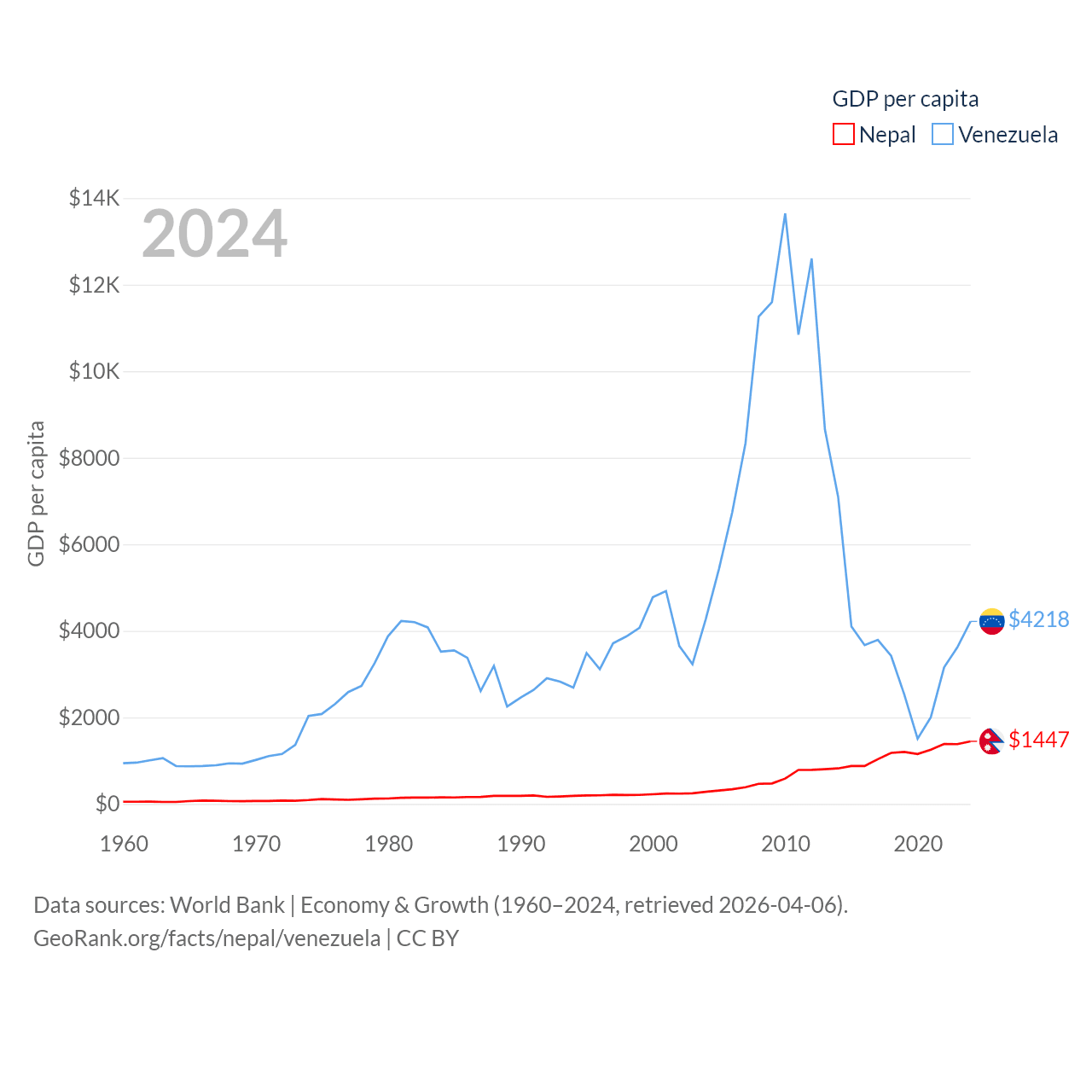 By GDP, Nepal ranks 101/197 ($42.9B) and Venezuela ranks 65/197 ($120B). By GDP per capita, Nepal ranks 164/197 ($1,447), while Venezuela ranks 128/197 ($4,218).