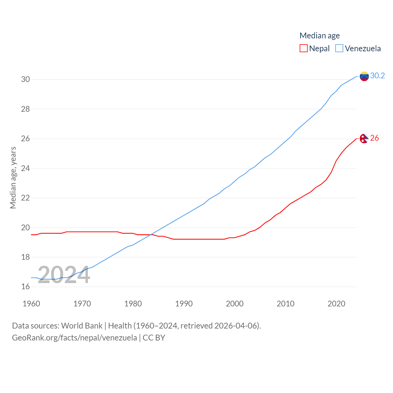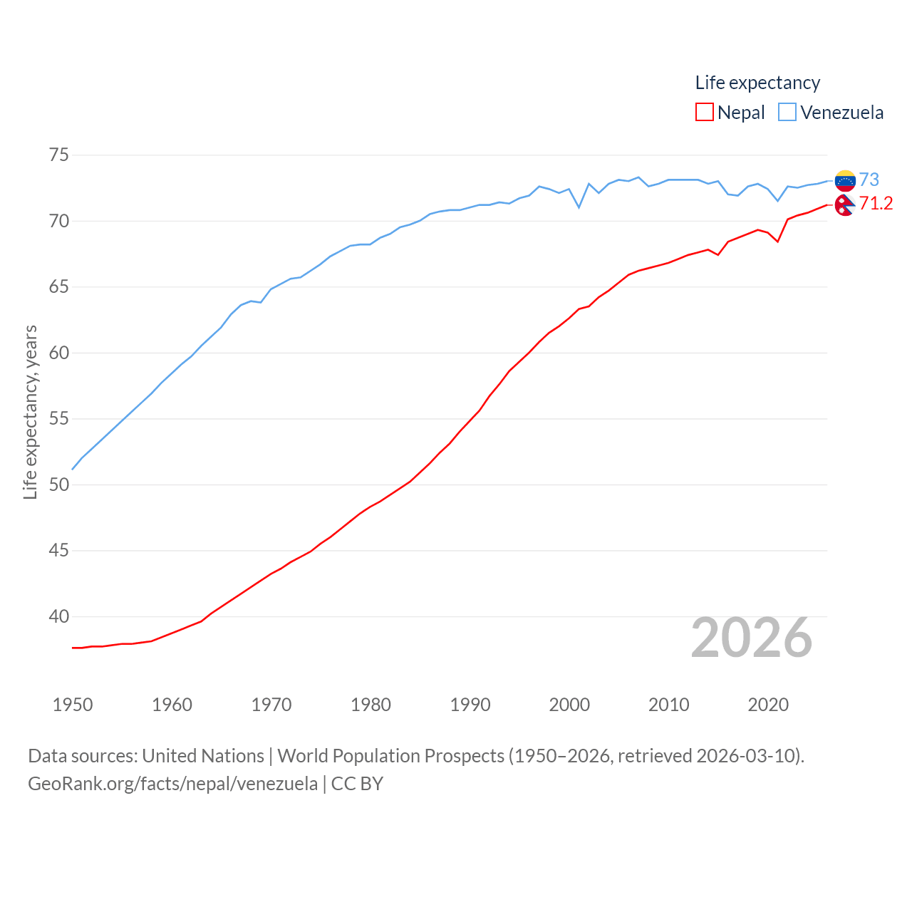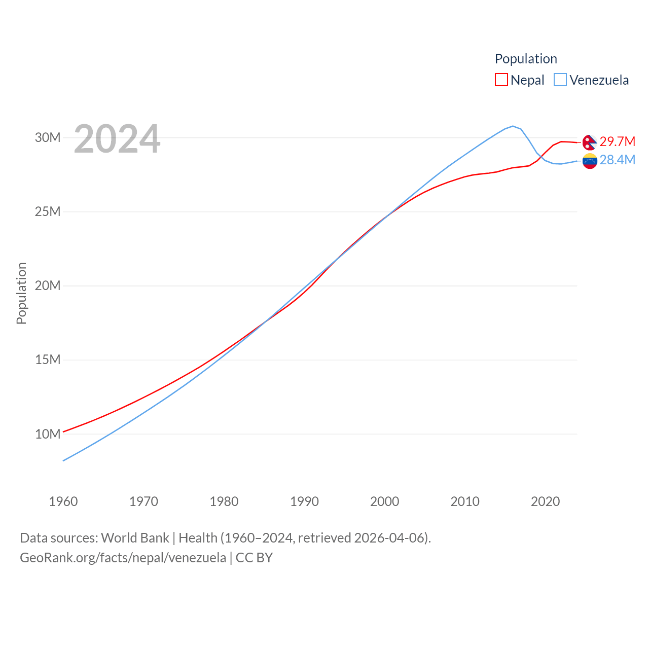 Nepal has a population of 29.7M (ranked 51/197), compared with 28.4M in Venezuela (ranked 53/197). Nepal's land area is 55,348 sq mi versus 340,561 sq mi for Venezuela (ranked 92nd vs. 32nd).