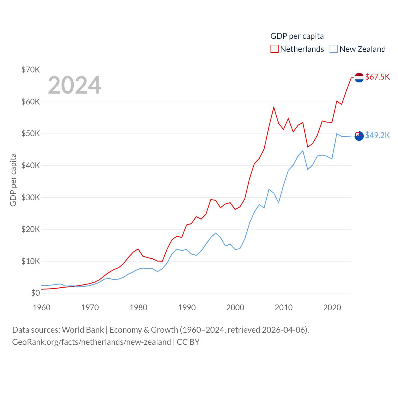 By GDP, The Netherlands ranks 19/197 ($1.21T) and New Zealand ranks 52/197 ($260B). By GDP per capita, The Netherlands ranks 13/197 ($67,520), while New Zealand ranks 26/197 ($49,205).