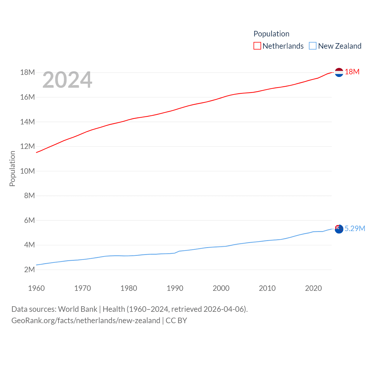 The Netherlands has a population of 18M (ranked 72/197), compared with 5.29M in New Zealand (ranked 123/197). The Netherlands' land area is 13,000 sq mi versus 101,665 sq mi for New Zealand (ranked 134th vs. 74th).