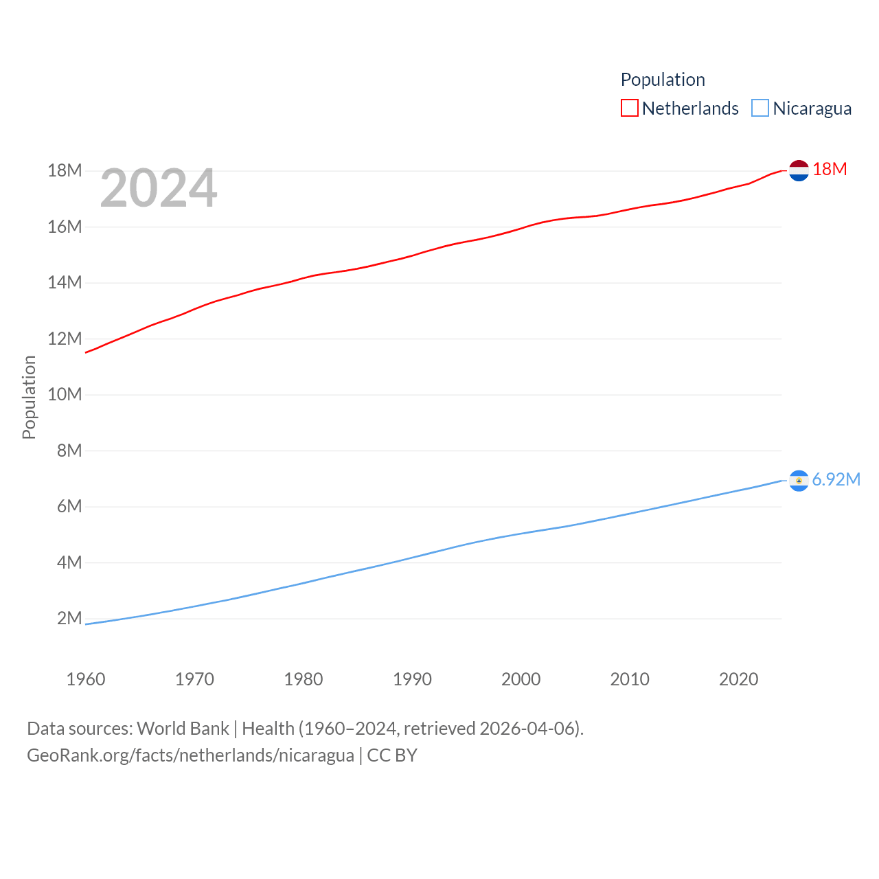 The Netherlands has a population of 18M (ranked 72/197), compared with 6.92M in Nicaragua (ranked 108/197). The Netherlands' land area is 13,000 sq mi versus 46,464 sq mi for Nicaragua (ranked 134th vs. 98th).