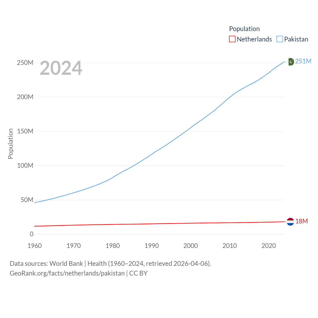 The Netherlands has a population of 18M (ranked 72/197), compared with 251M in Pakistan (ranked 5/197). The Netherlands' land area is 13,000 sq mi versus 297,638 sq mi for Pakistan (ranked 134th vs. 35th).