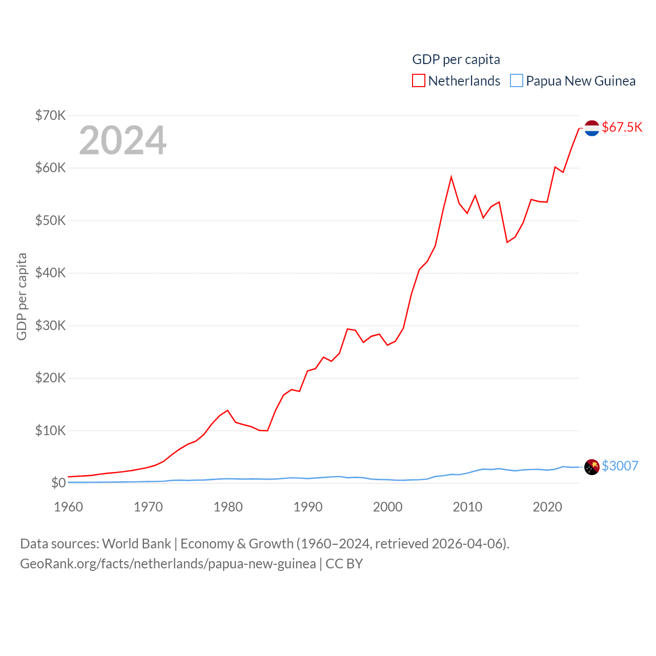 By GDP, The Netherlands ranks 19/197 ($1.21T) and Papua New Guinea ranks 110/197 ($31.8B). By GDP per capita, The Netherlands ranks 13/197 ($67,520), while Papua New Guinea ranks 140/197 ($3,007).