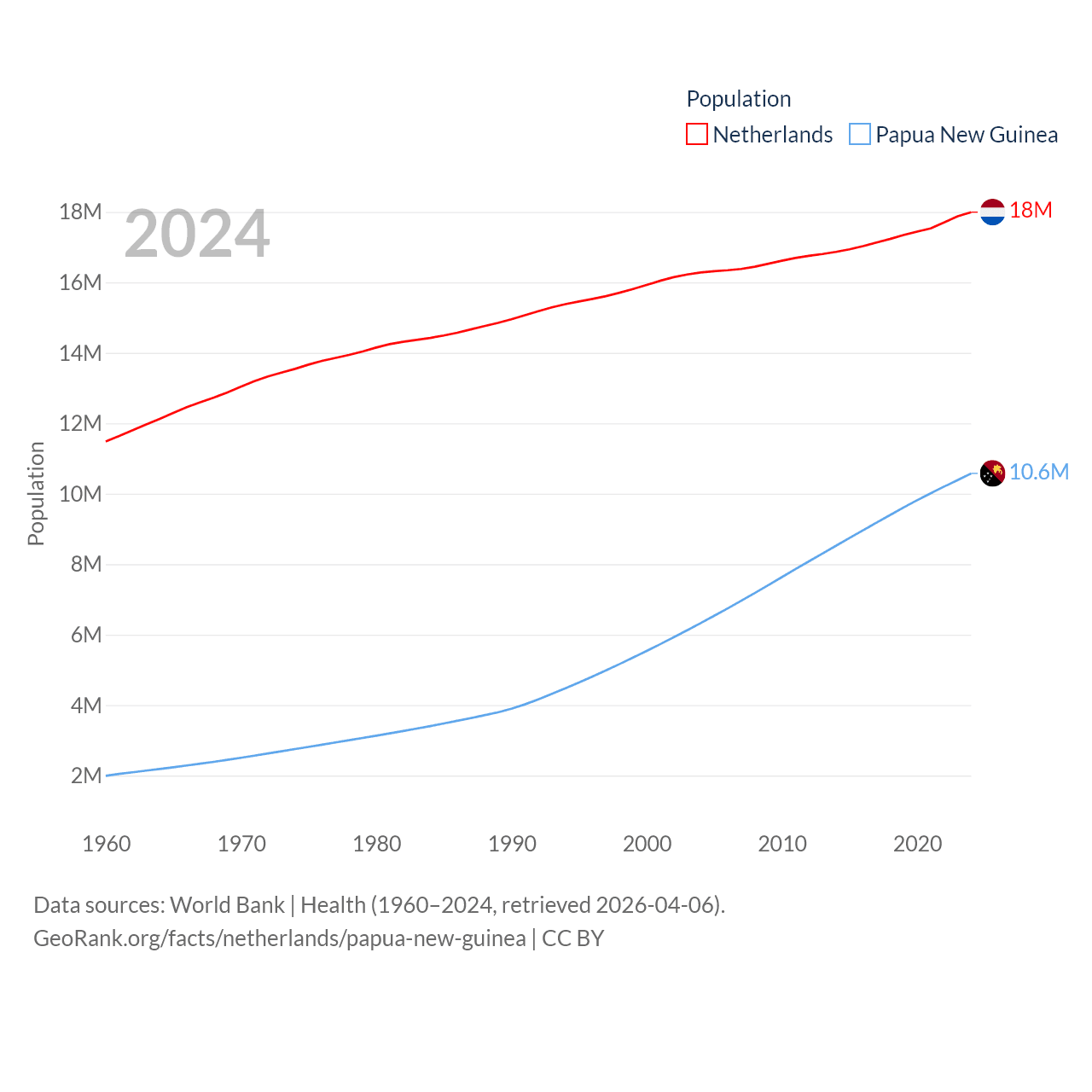 The Netherlands has a population of 18M (ranked 72/197), compared with 10.6M in Papua New Guinea (ranked 92/197). The Netherlands' land area is 13,000 sq mi versus 174,850 sq mi for Papua New Guinea (ranked 134th vs. 54th).