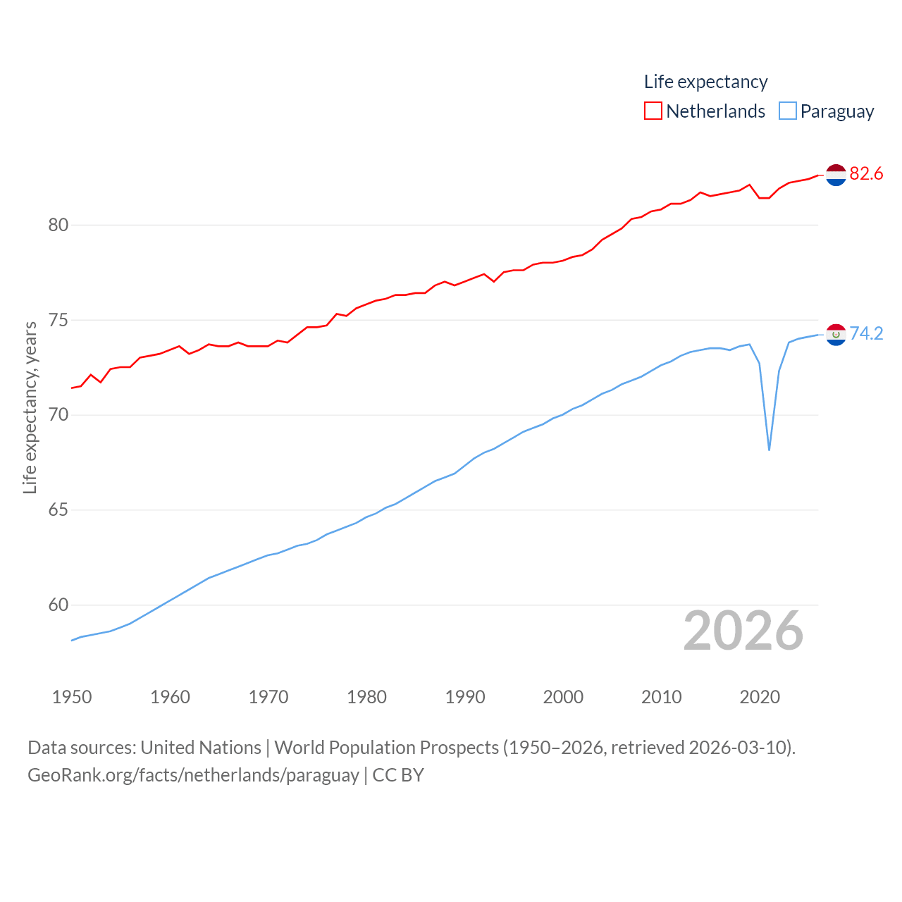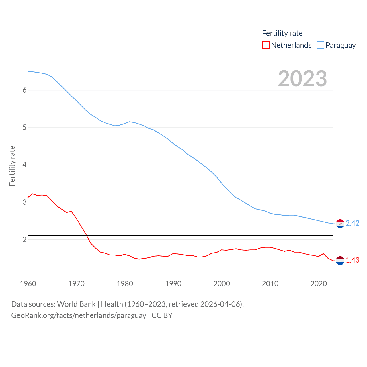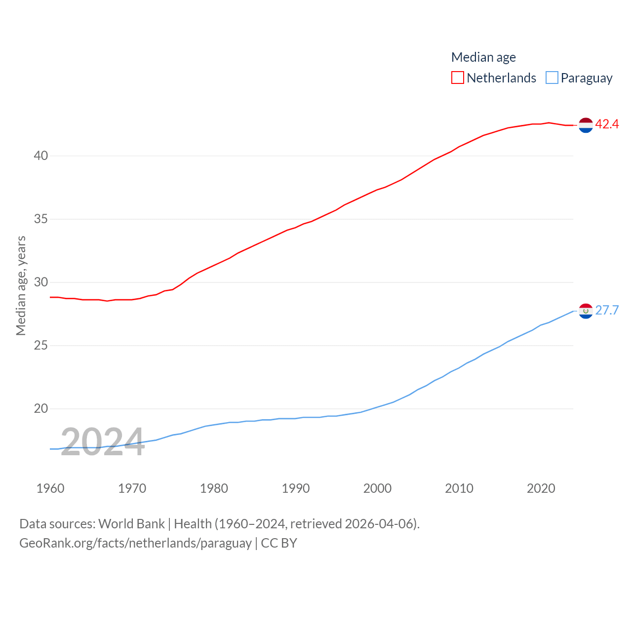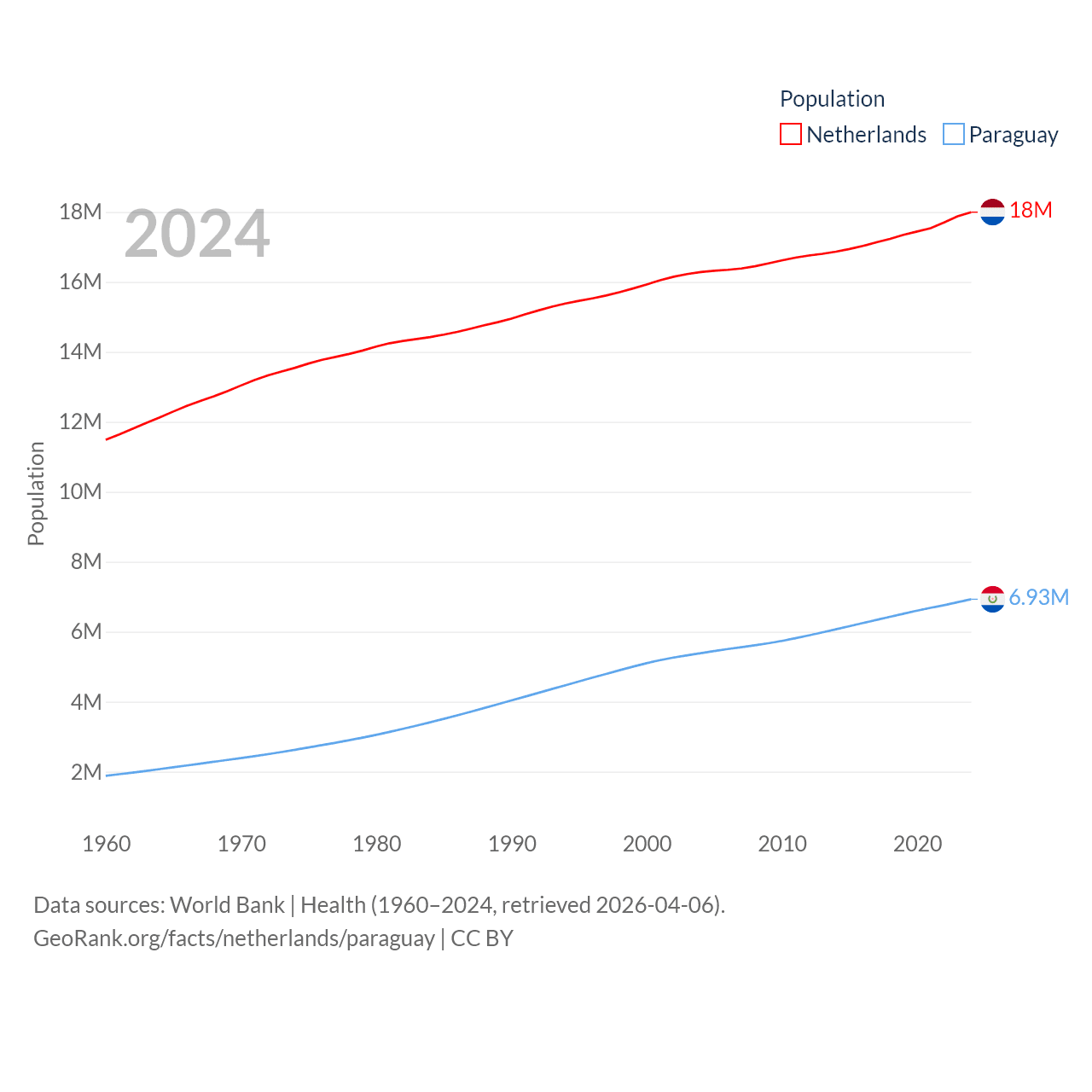 The Netherlands has a population of 18M (ranked 72/197), compared with 6.93M in Paraguay (ranked 107/197). The Netherlands' land area is 13,000 sq mi versus 152,901 sq mi for Paraguay (ranked 134th vs. 59th).