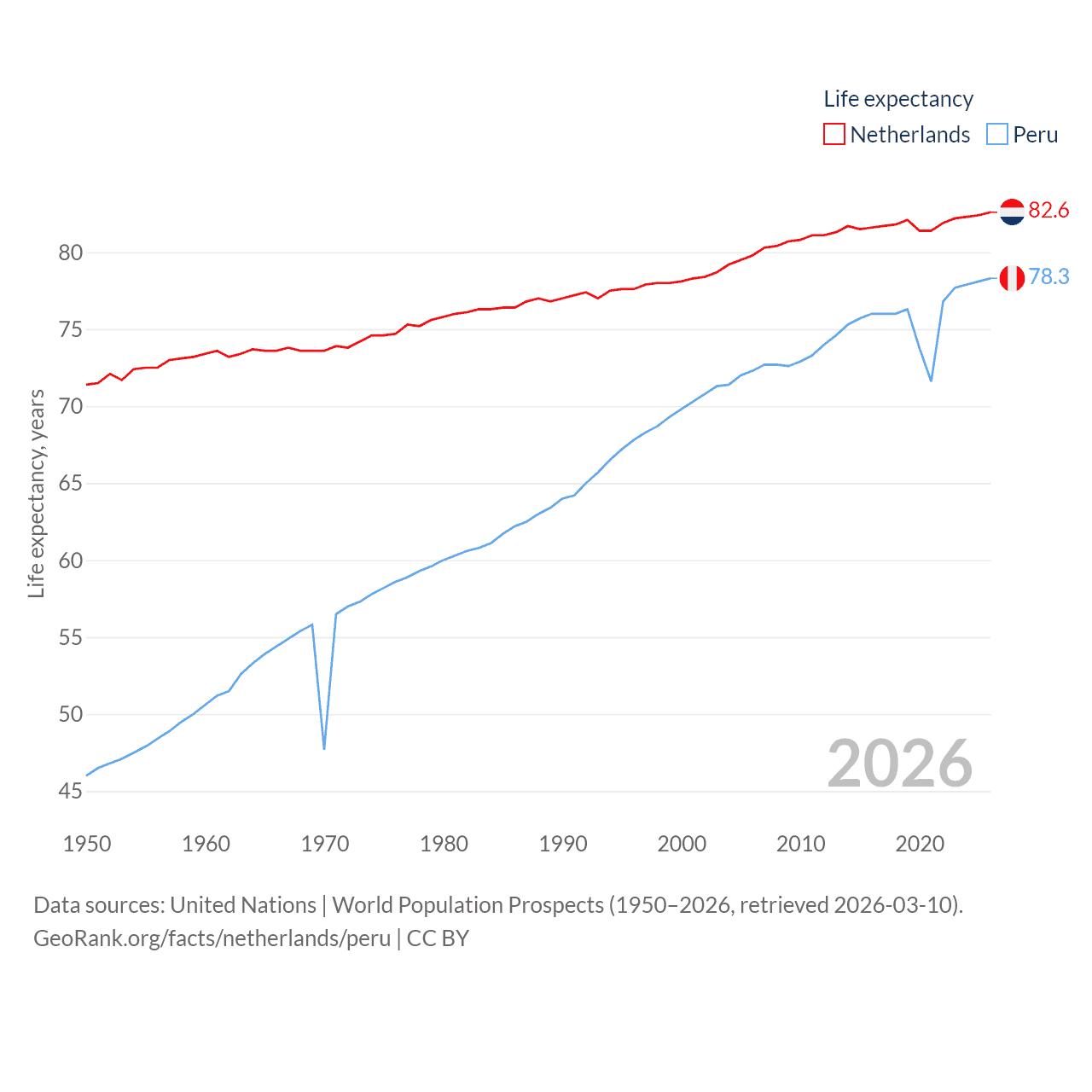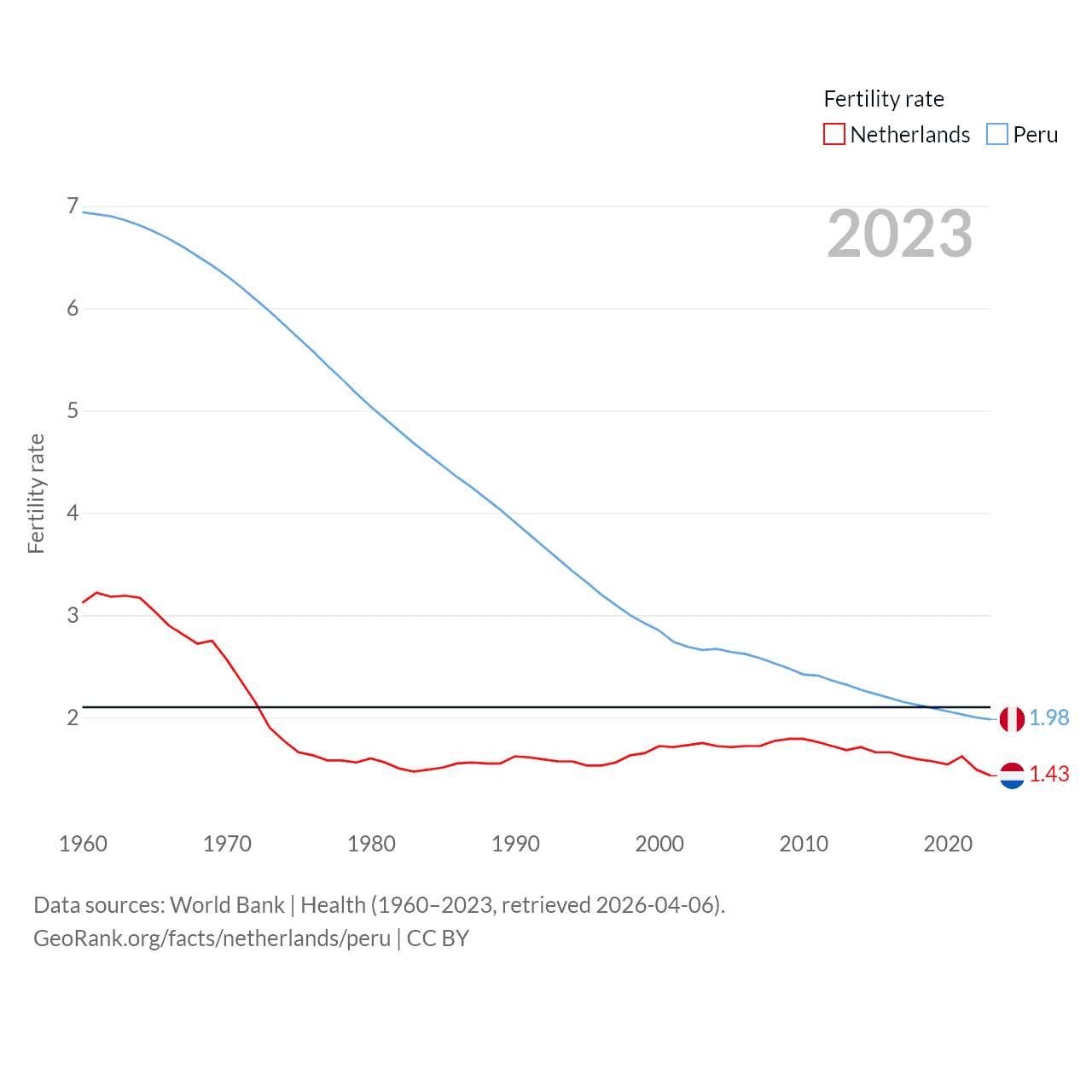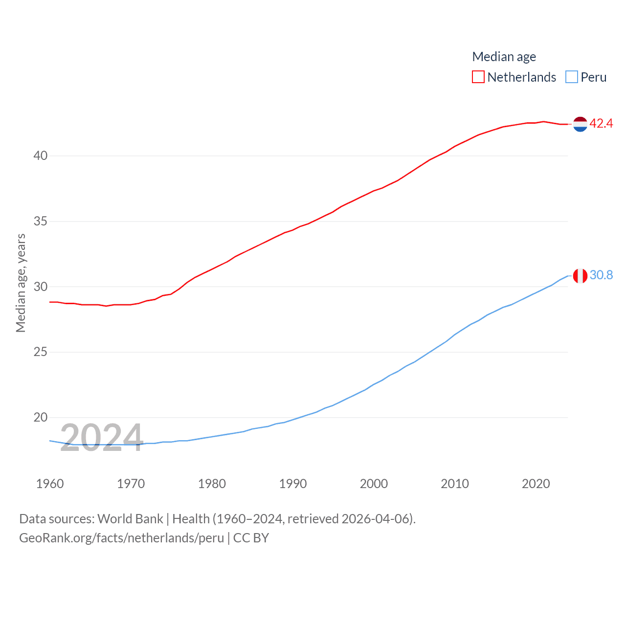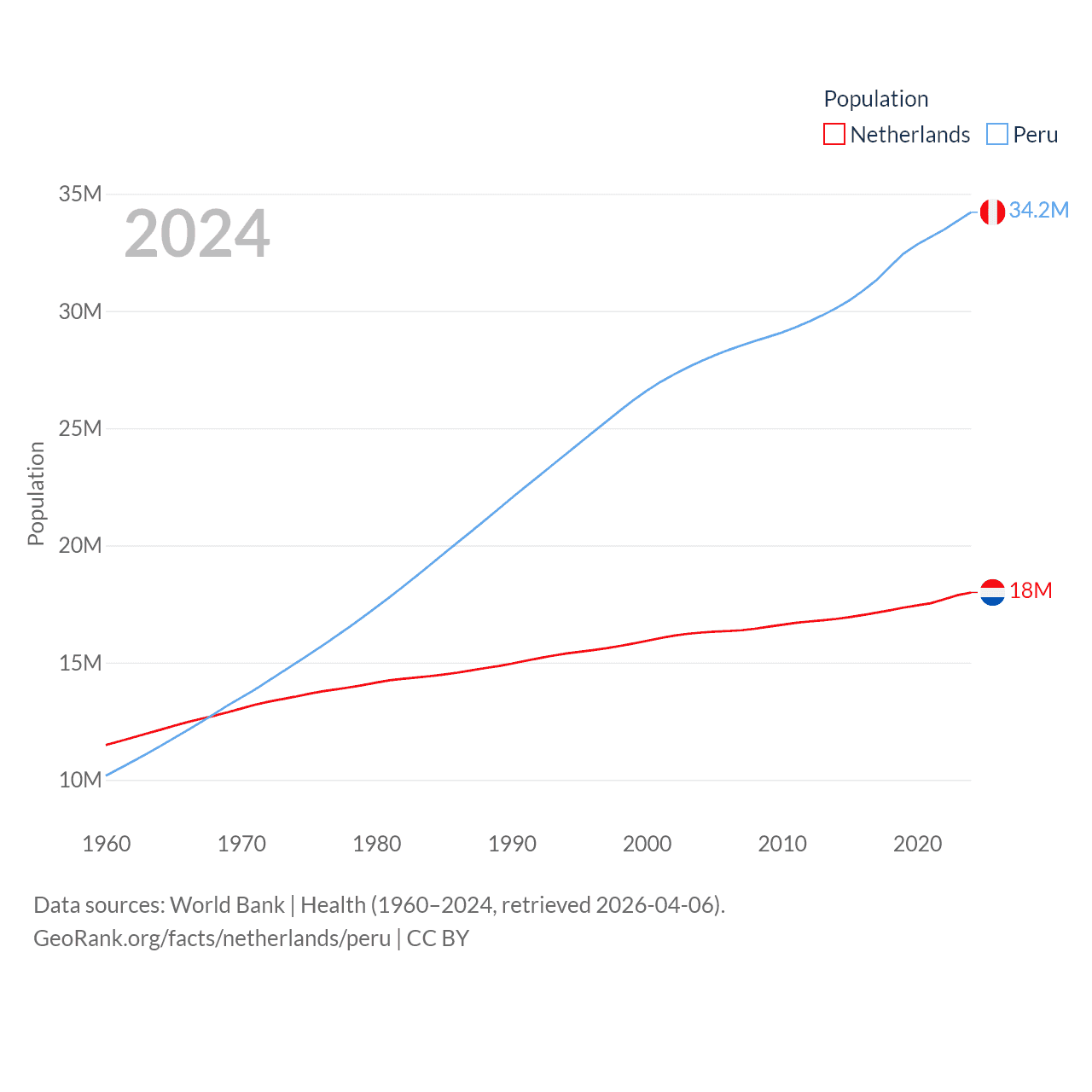 The Netherlands has a population of 18M (ranked 72/197), compared with 34.2M in Peru (ranked 48/197). The Netherlands' land area is 13,000 sq mi versus 494,211 sq mi for Peru (ranked 134th vs. 19th).