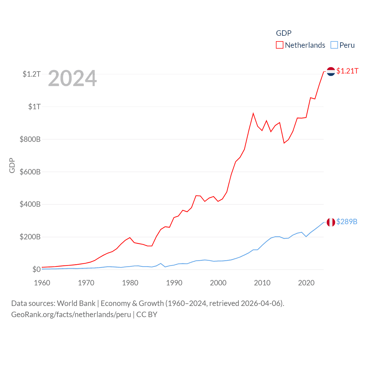 By GDP, The Netherlands ranks 19/197 ($1.21T) and Peru ranks 49/197 ($289B). By GDP per capita, The Netherlands ranks 13/197 ($67,520), while Peru ranks 91/197 ($8,452).