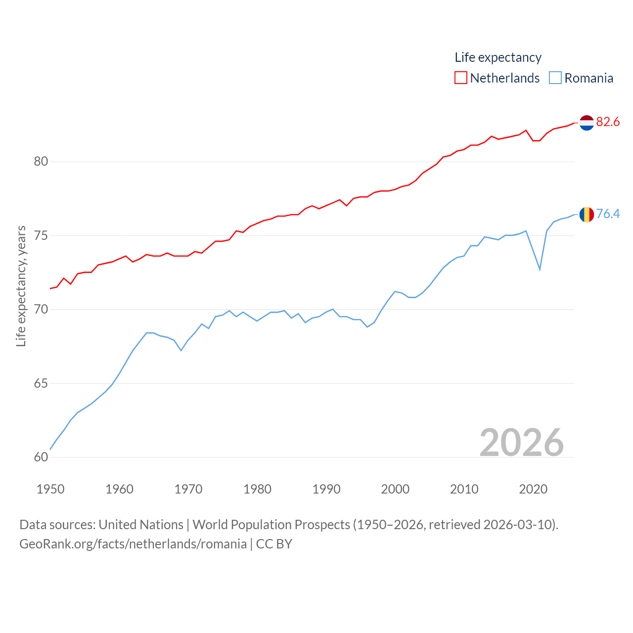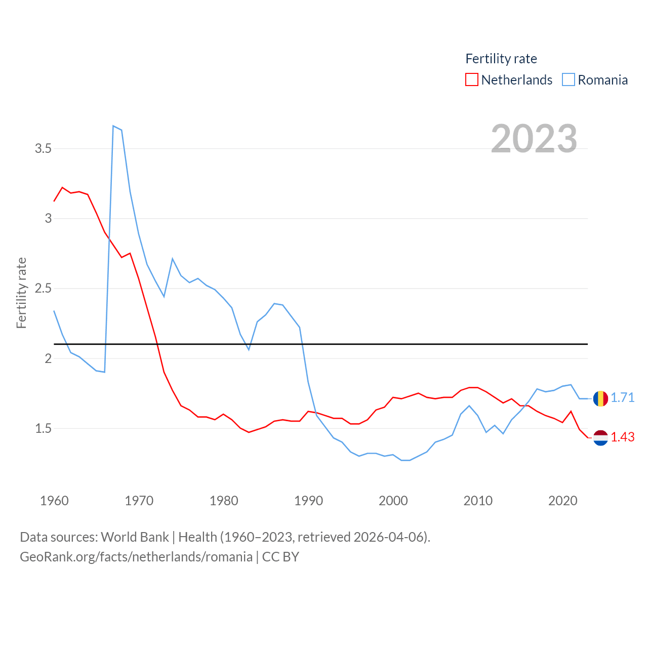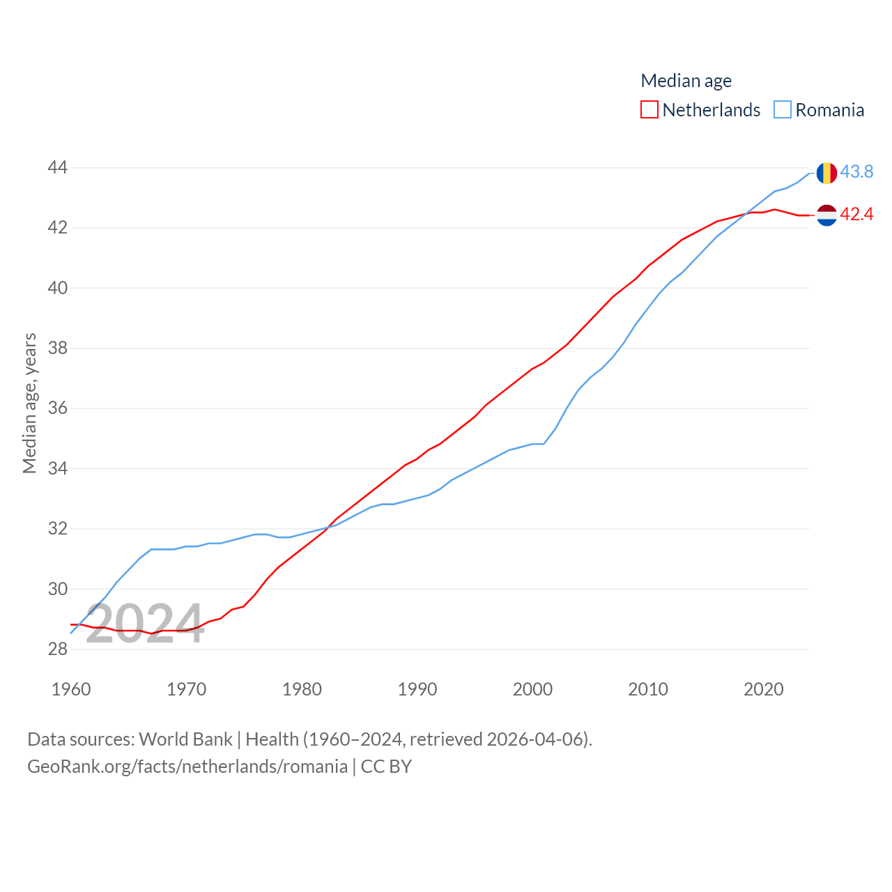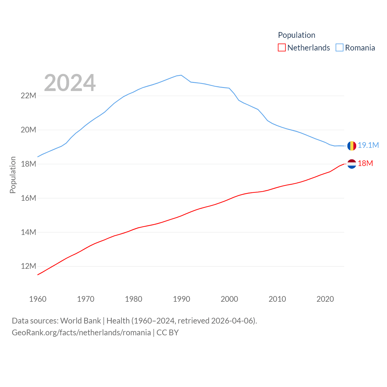 The Netherlands has a population of 18M (ranked 72/197), compared with 19.1M in Romania (ranked 67/197). The Netherlands' land area is 13,000 sq mi versus 88,834 sq mi for Romania (ranked 134th vs. 80th).