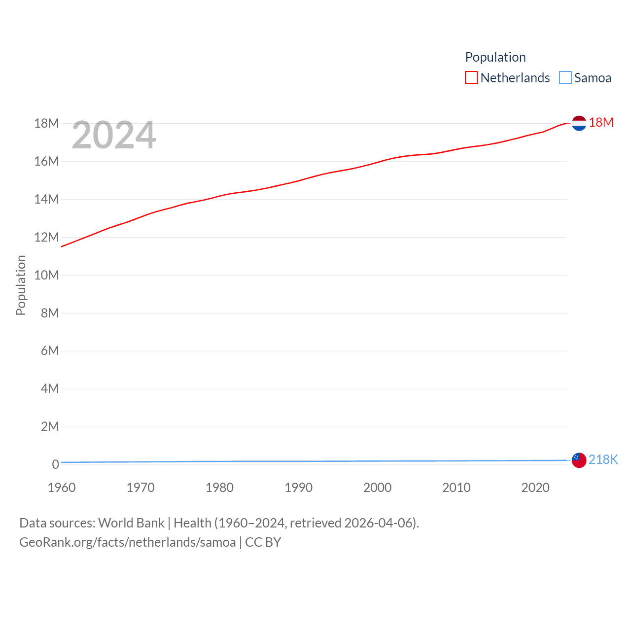 The Netherlands has a population of 18M (ranked 72/197), compared with 218K in Samoa (ranked 177/197). The Netherlands' land area is 13,000 sq mi versus 1,073 sq mi for Samoa (ranked 134th vs. 168th).