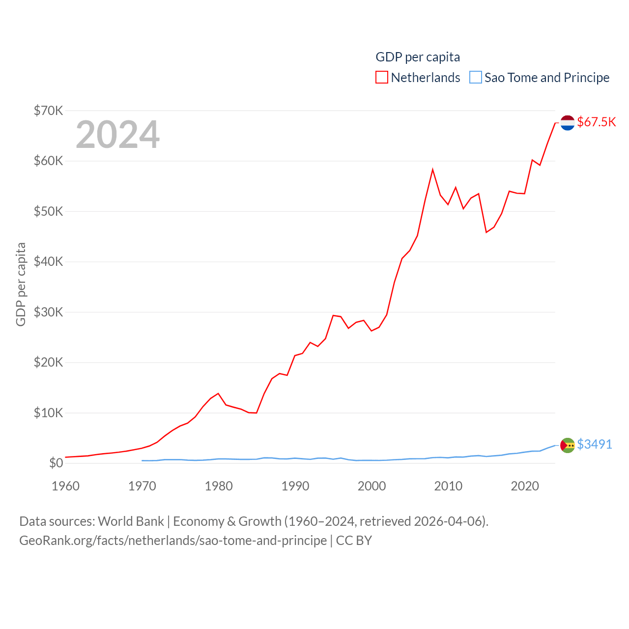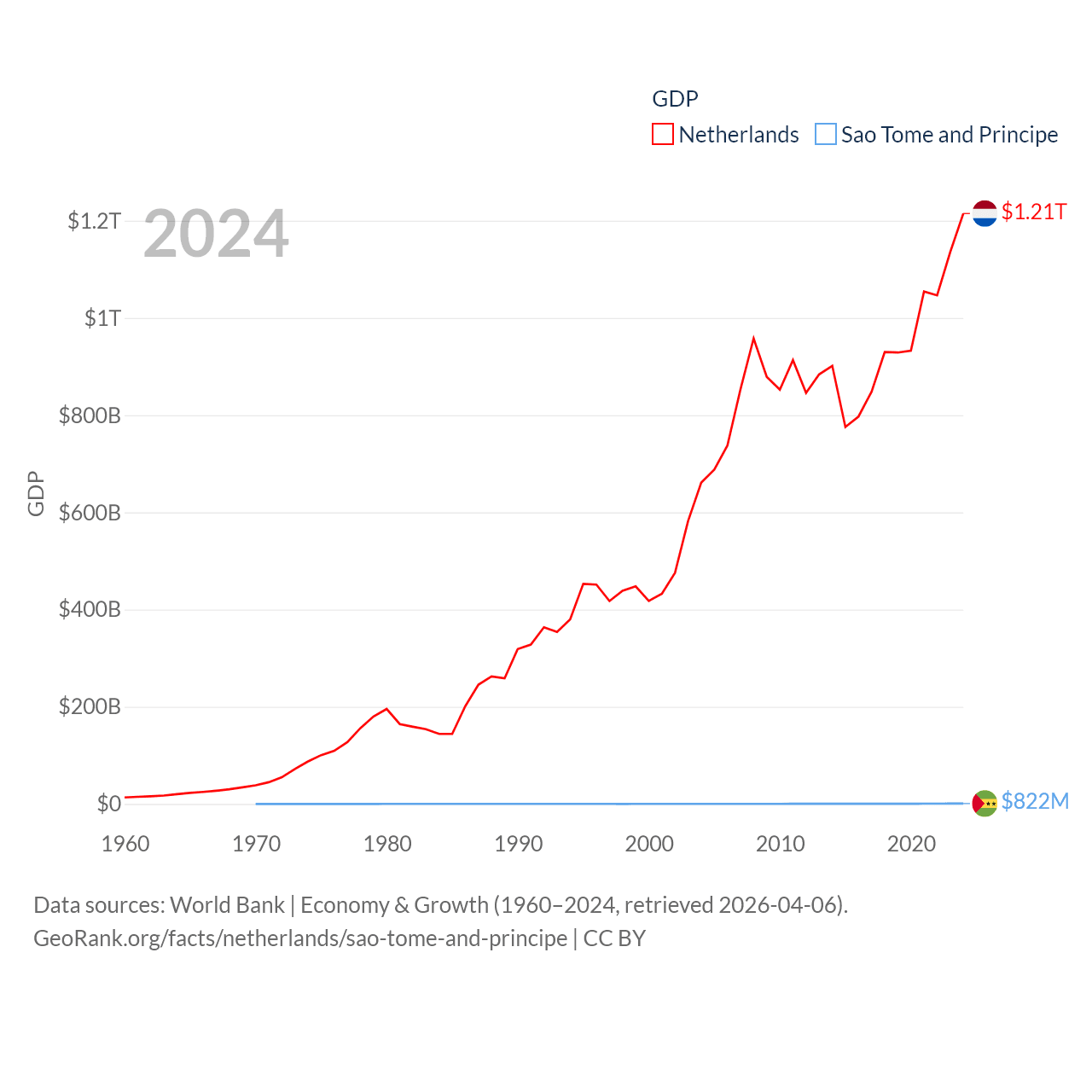 By GDP, The Netherlands ranks 19/197 ($1.21T) and Sao Tome and Principe ranks 189/197 ($822M). By GDP per capita, The Netherlands ranks 13/197 ($67,520), while Sao Tome and Principe ranks 134/197 ($3,491).