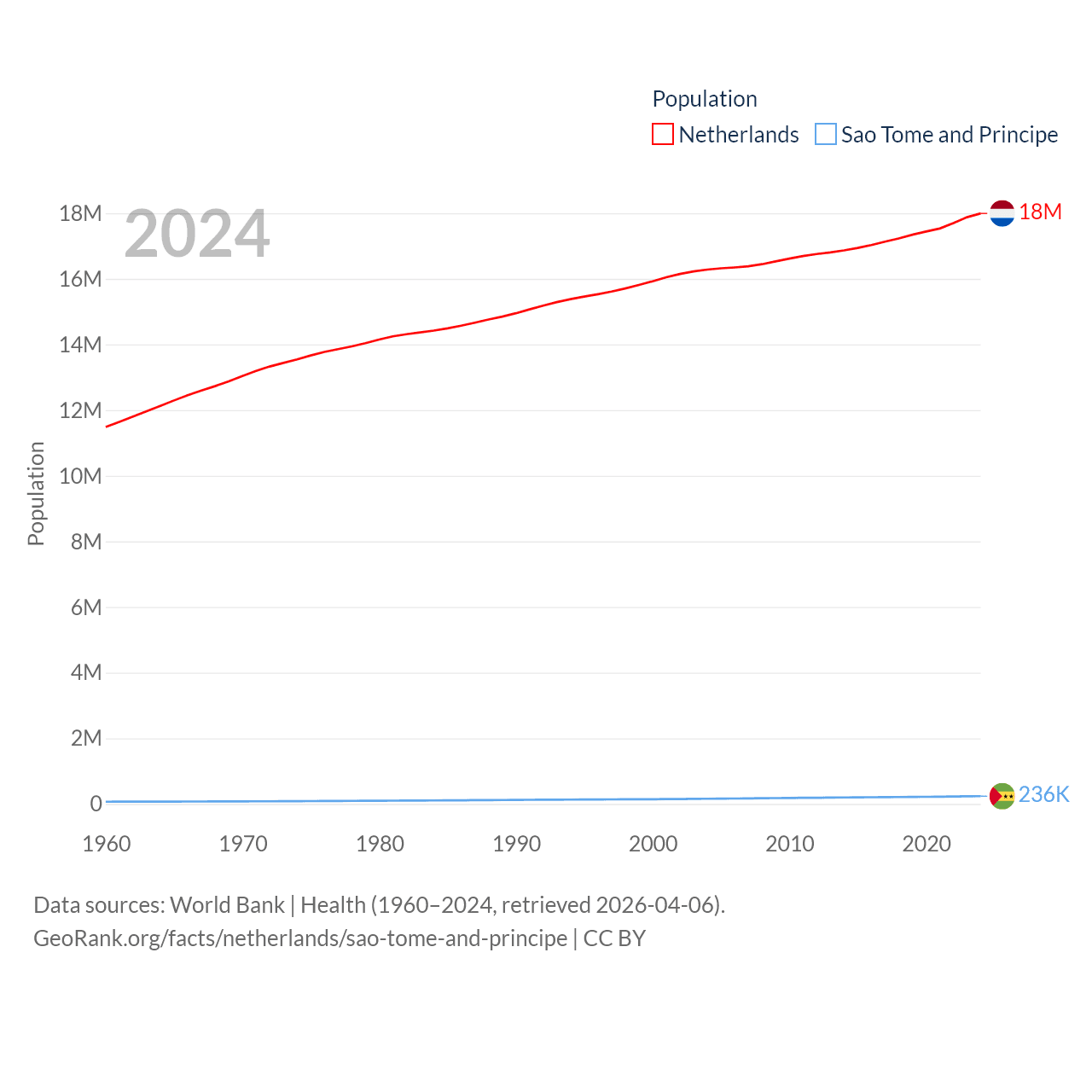 The Netherlands has a population of 18M (ranked 72/197), compared with 236K in Sao Tome and Principe (ranked 176/197). The Netherlands' land area is 13,000 sq mi versus 371 sq mi for Sao Tome and Principe (ranked 134th vs. 172nd).