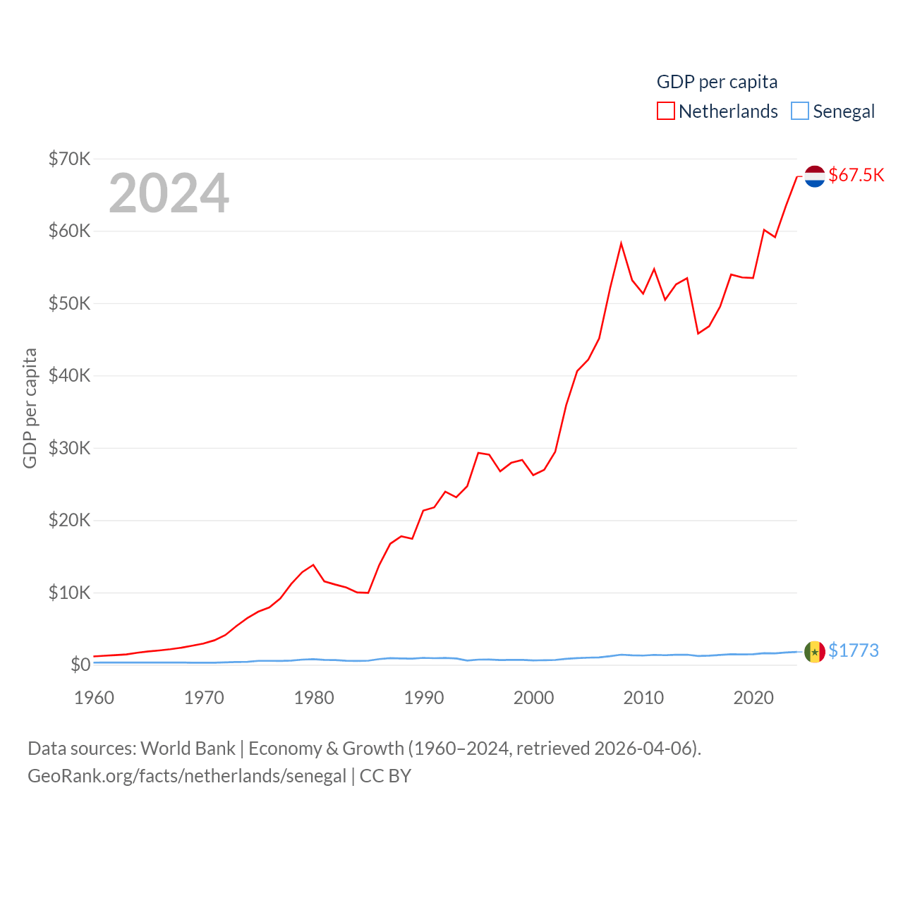 By GDP, The Netherlands ranks 19/197 ($1.21T) and Senegal ranks 109/197 ($32.8B). By GDP per capita, The Netherlands ranks 13/197 ($67,520), while Senegal ranks 159/197 ($1,773).