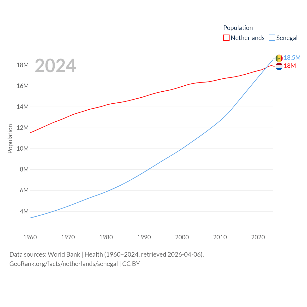 The Netherlands has a population of 18M (ranked 72/197), compared with 18.5M in Senegal (ranked 69/197). The Netherlands' land area is 13,000 sq mi versus 74,336 sq mi for Senegal (ranked 134th vs. 85th).