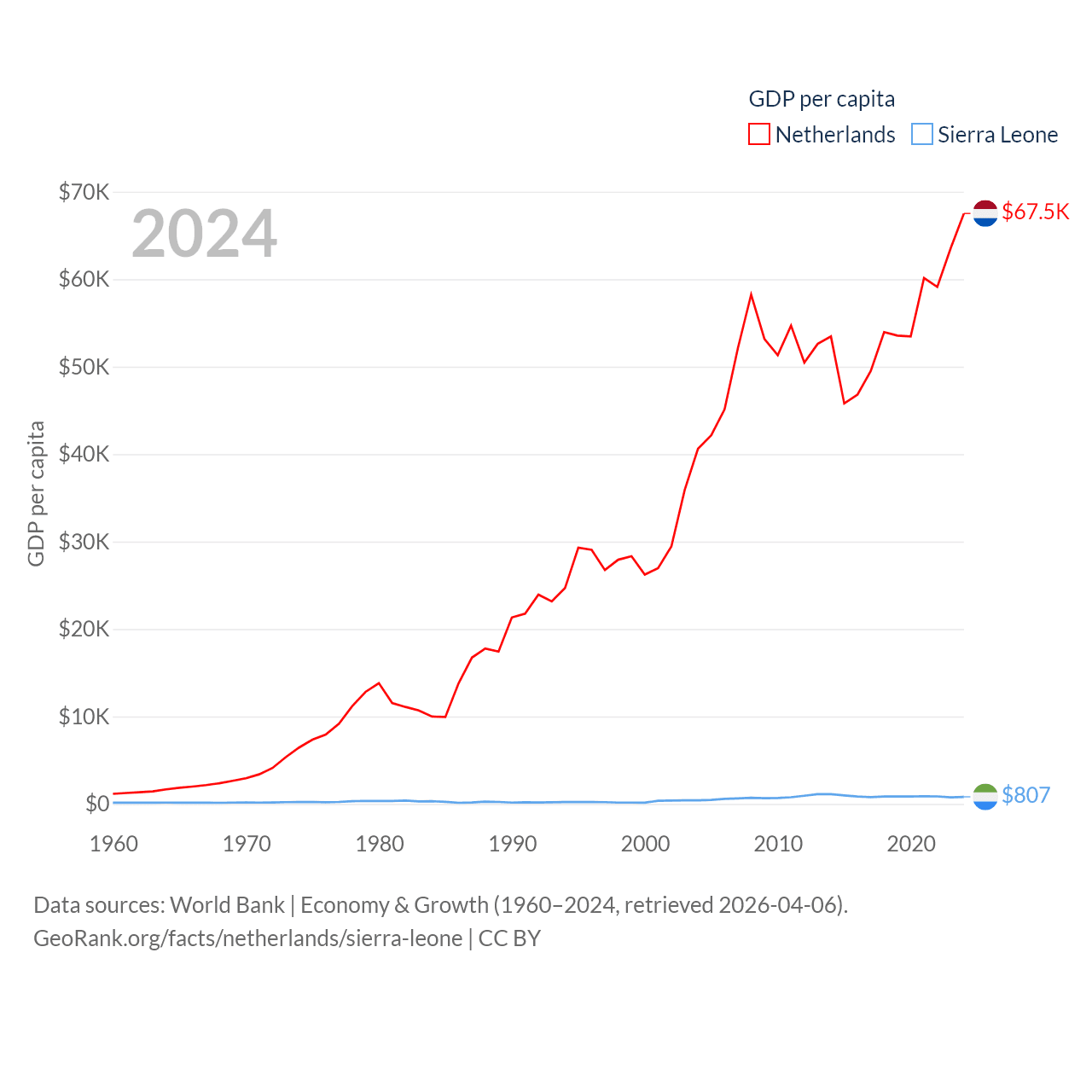 By GDP, The Netherlands ranks 19/197 ($1.21T) and Sierra Leone ranks 160/197 ($6.97B). By GDP per capita, The Netherlands ranks 13/197 ($67,520), while Sierra Leone ranks 186/197 ($807).