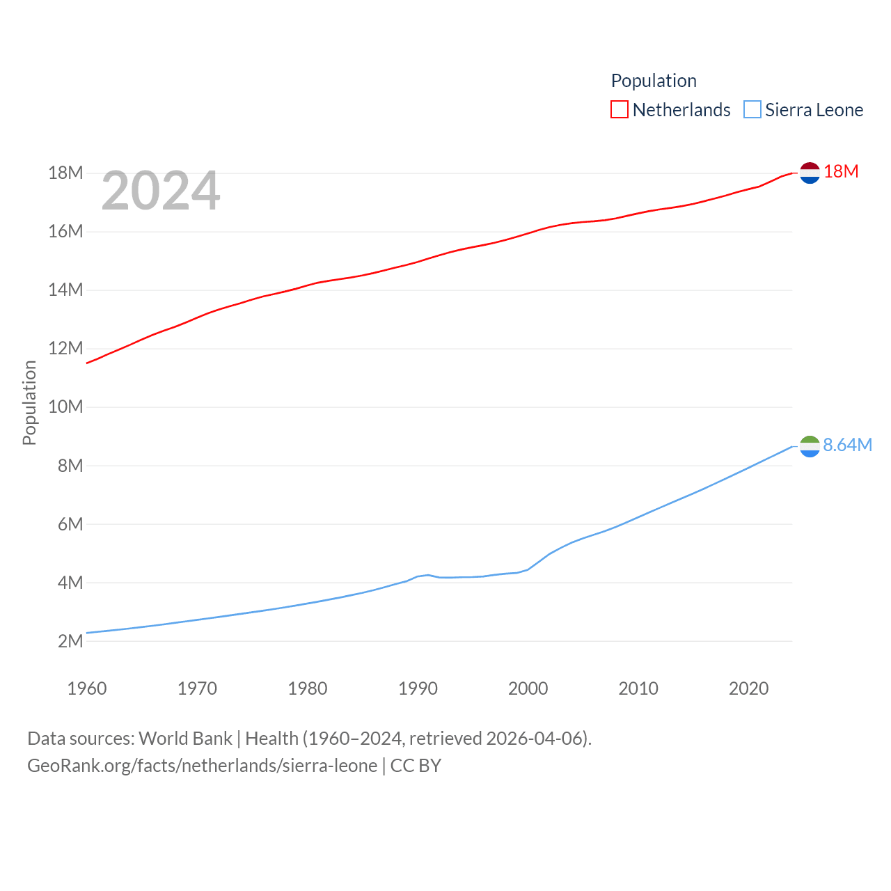 The Netherlands has a population of 18M (ranked 72/197), compared with 8.64M in Sierra Leone (ranked 102/197). The Netherlands' land area is 13,000 sq mi versus 27,869 sq mi for Sierra Leone (ranked 134th vs. 116th).