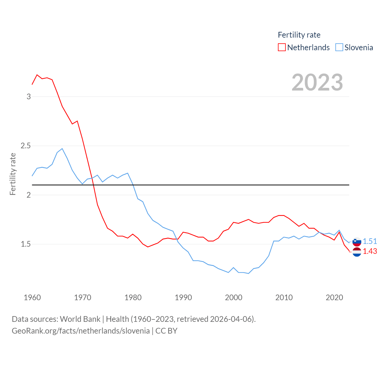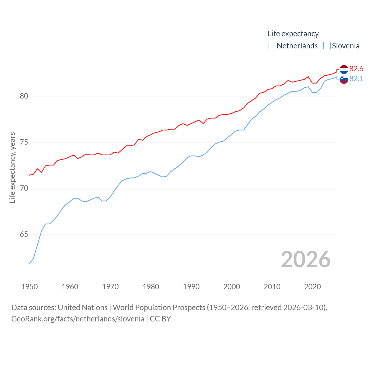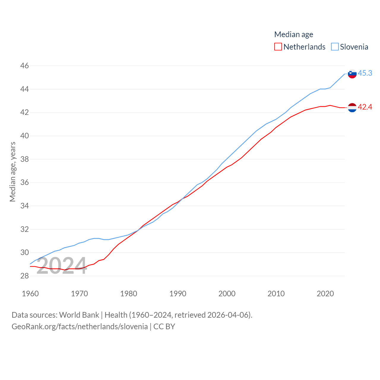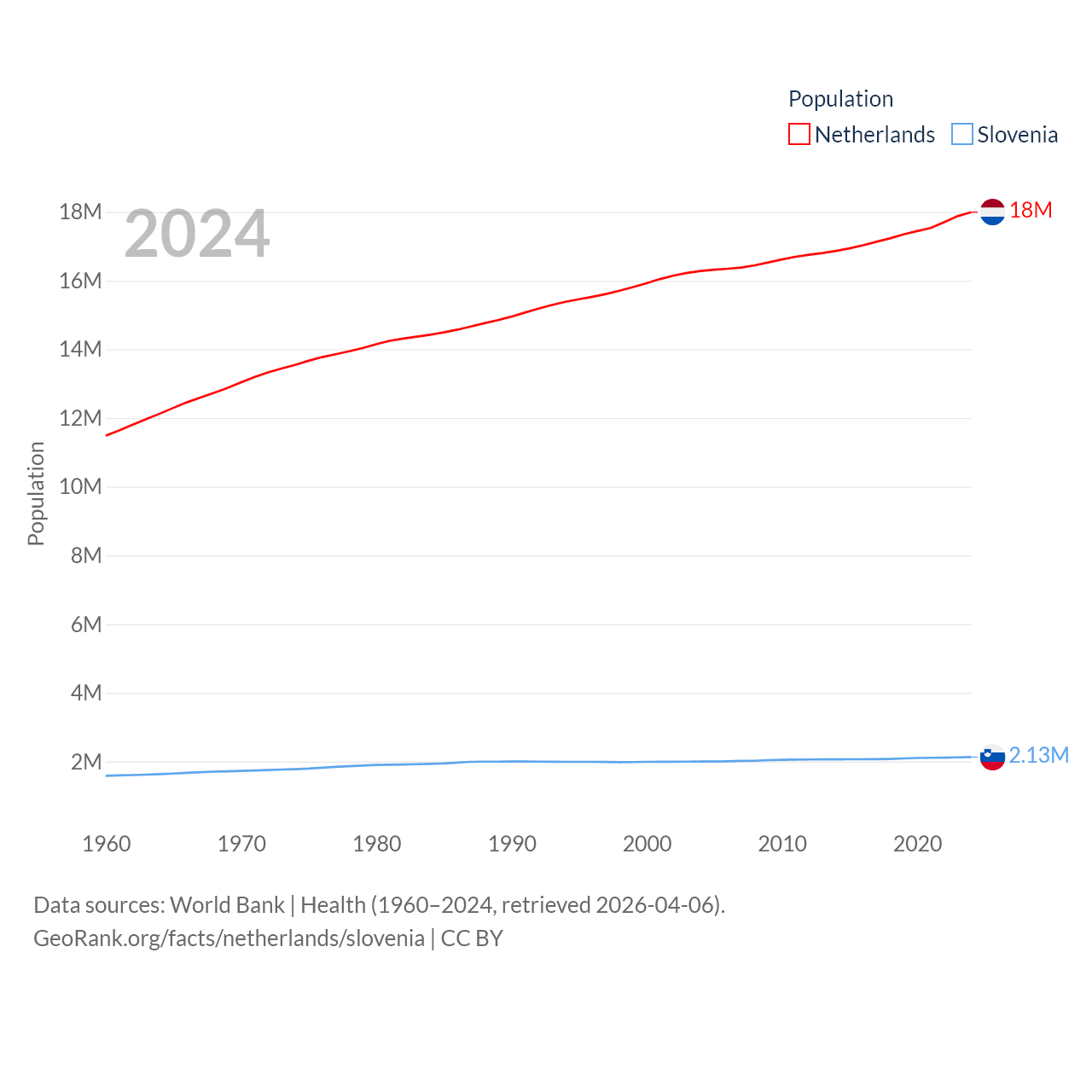 The Netherlands has a population of 18M (ranked 72/197), compared with 2.13M in Slovenia (ranked 147/197). The Netherlands' land area is 13,000 sq mi versus 7,774 sq mi for Slovenia (ranked 134th vs. 151st).