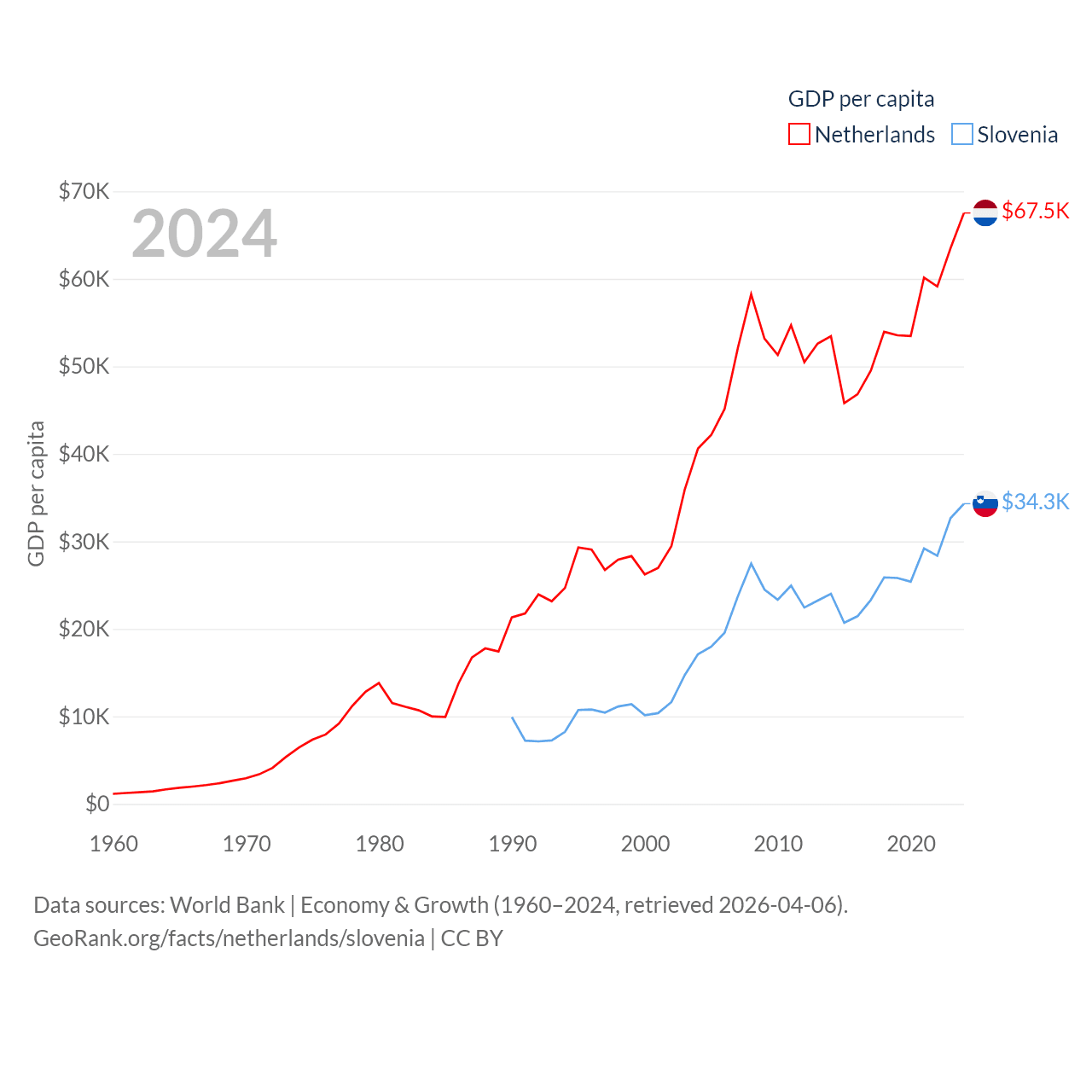 By GDP, The Netherlands ranks 19/197 ($1.21T) and Slovenia ranks 86/197 ($73B). By GDP per capita, The Netherlands ranks 13/197 ($67,520), while Slovenia ranks 34/197 ($34,301).