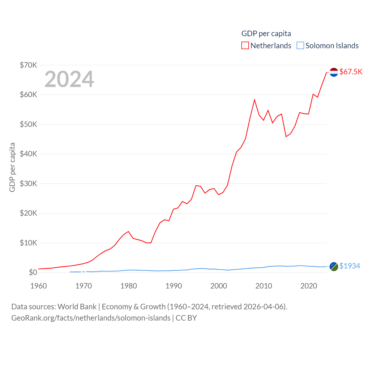 By GDP, The Netherlands ranks 19/197 ($1.21T) and The Solomon Islands ranks 182/197 ($1.58B). By GDP per capita, The Netherlands ranks 13/197 ($67,520), while The Solomon Islands ranks 157/197 ($1,934).