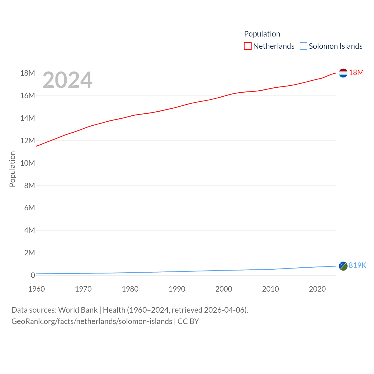 The Netherlands has a population of 18M (ranked 72/197), compared with 819K in The Solomon Islands (ranked 162/197). The Netherlands' land area is 13,000 sq mi versus 10,807 sq mi for The Solomon Islands (ranked 134th vs. 141st).