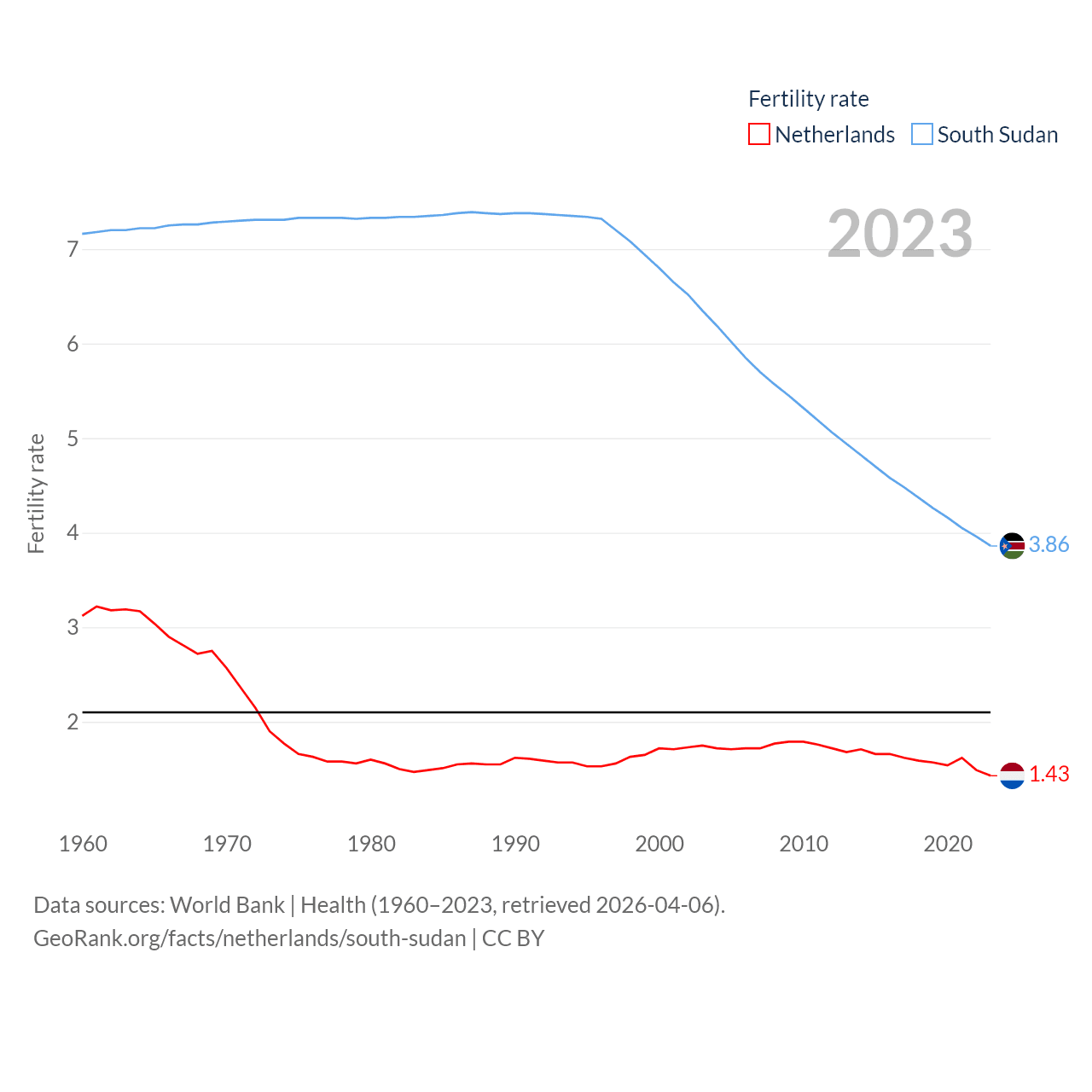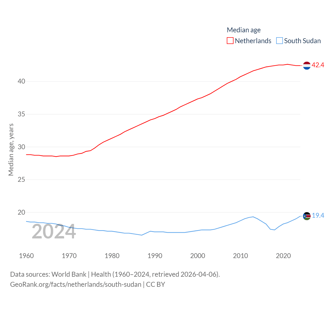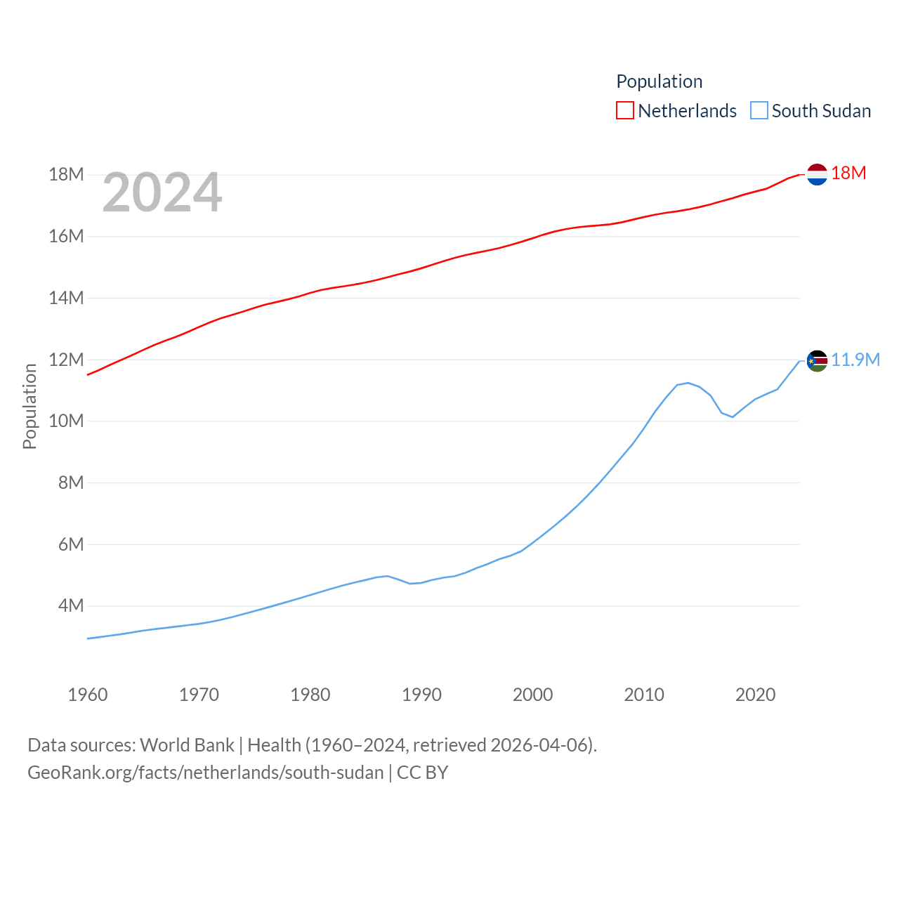 The Netherlands has a population of 18M (ranked 72/197), compared with 11.9M in South Sudan (ranked 81/197). The Netherlands' land area is 13,000 sq mi versus 243,990 sq mi for South Sudan (ranked 134th vs. 41st).