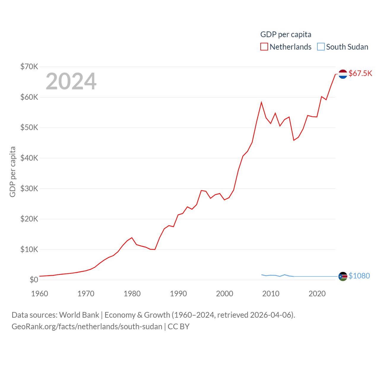By GDP, The Netherlands ranks 19/197 ($1.21T) and South Sudan ranks 149/197 ($12B). By GDP per capita, The Netherlands ranks 13/197 ($67,520), while South Sudan ranks 175/197 ($1,080).