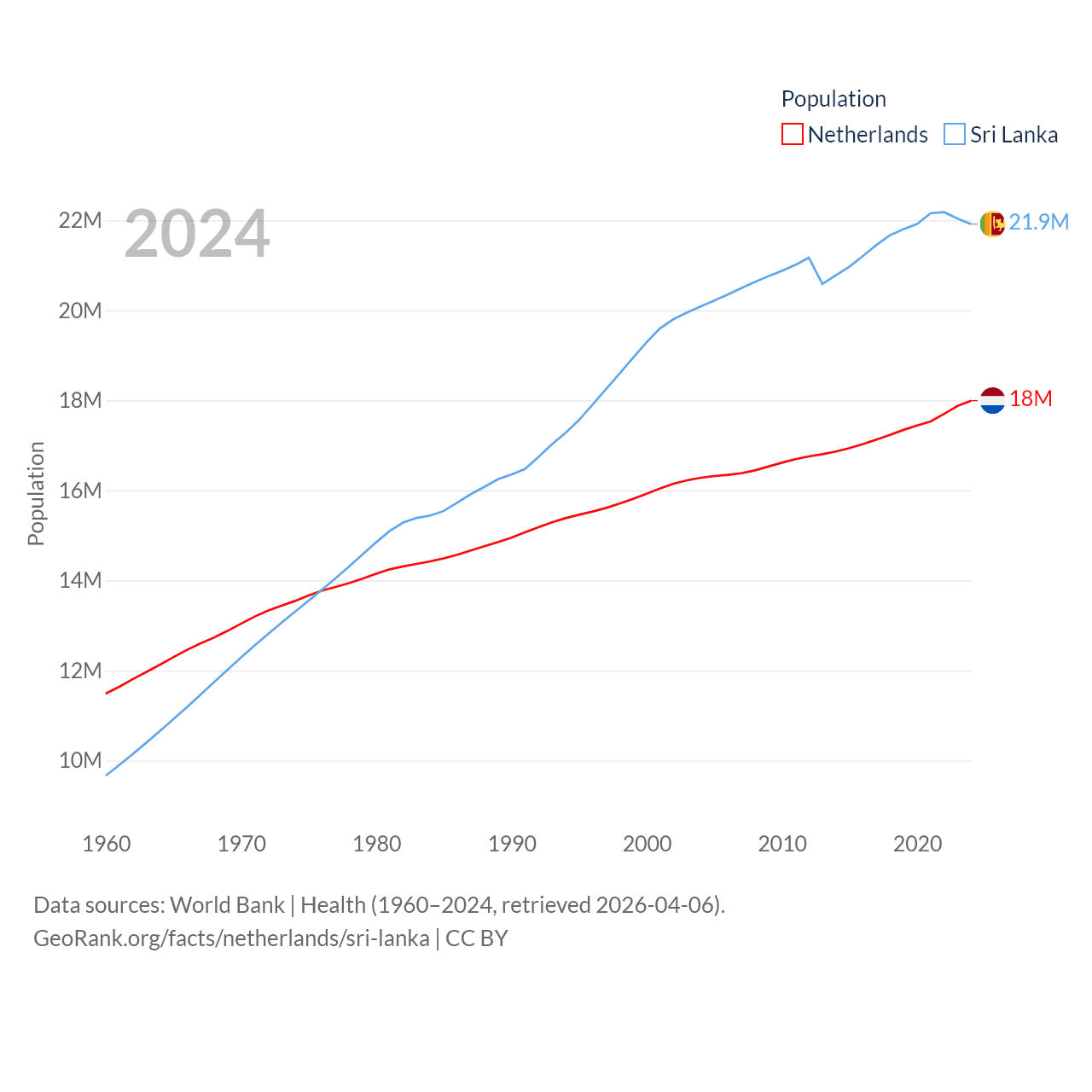 The Netherlands has a population of 18M (ranked 72/197), compared with 21.9M in Sri Lanka (ranked 61/197). The Netherlands' land area is 13,000 sq mi versus 23,884 sq mi for Sri Lanka (ranked 134th vs. 122nd).