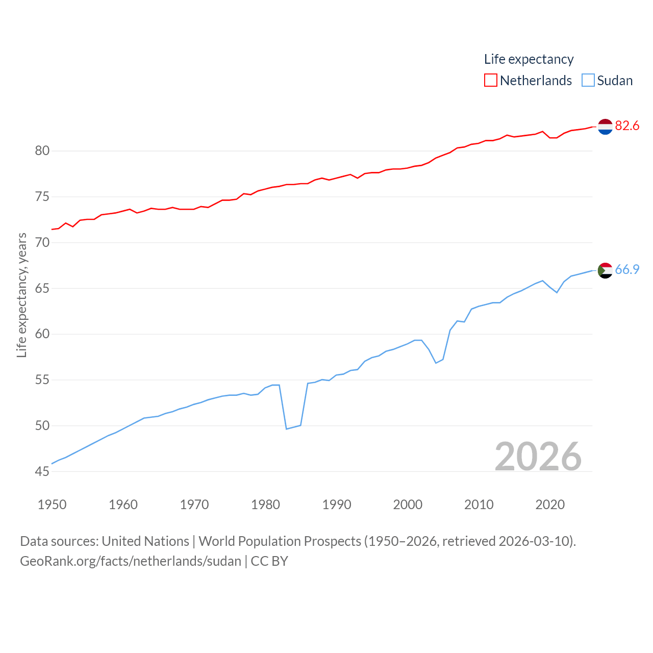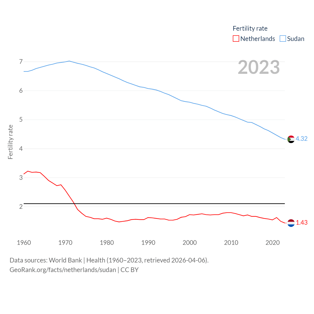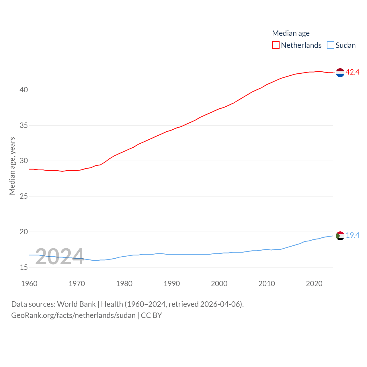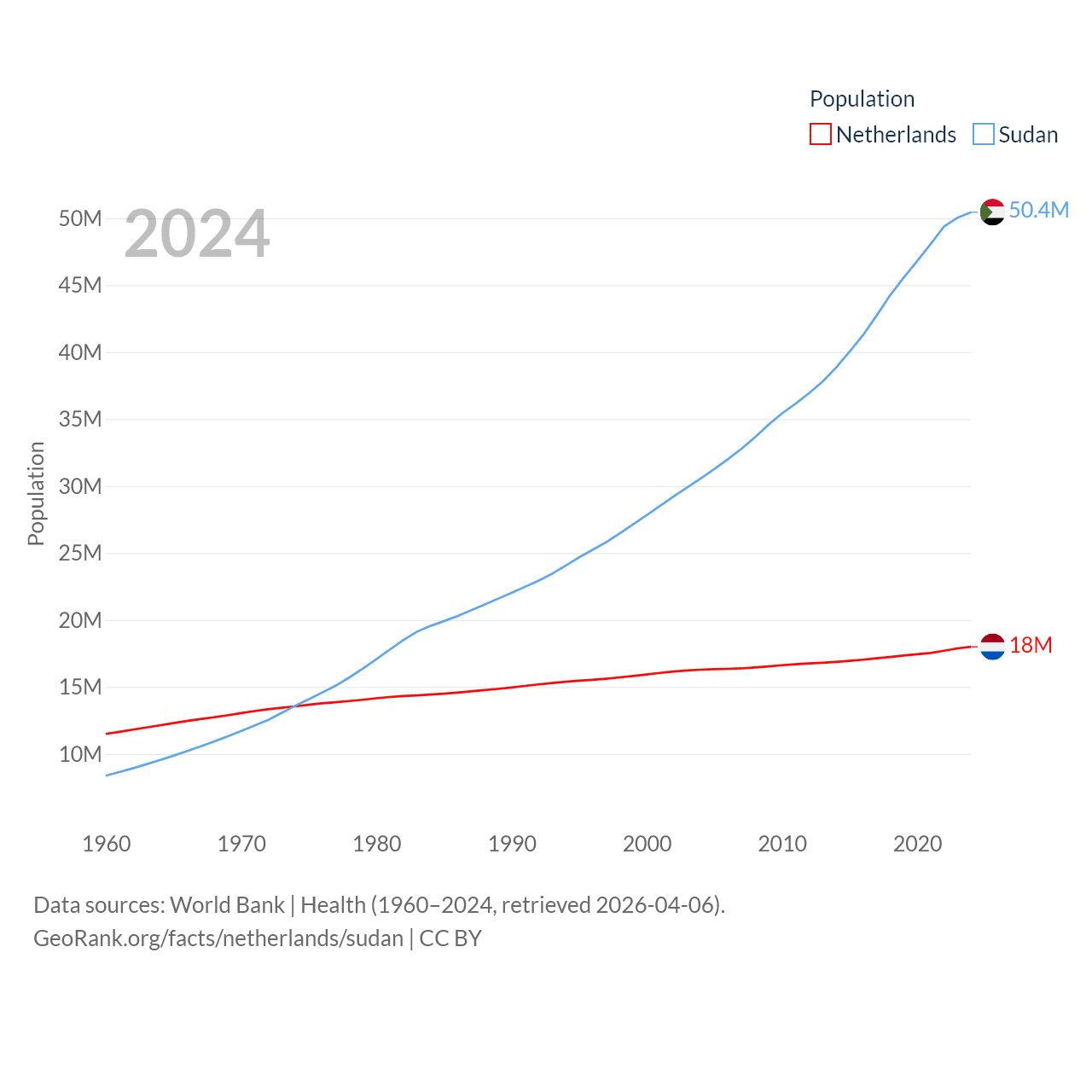 The Netherlands has a population of 18M (ranked 72/197), compared with 50.4M in Sudan (ranked 30/197). The Netherlands' land area is 13,000 sq mi versus 721,239 sq mi for Sudan (ranked 134th vs. 15th).