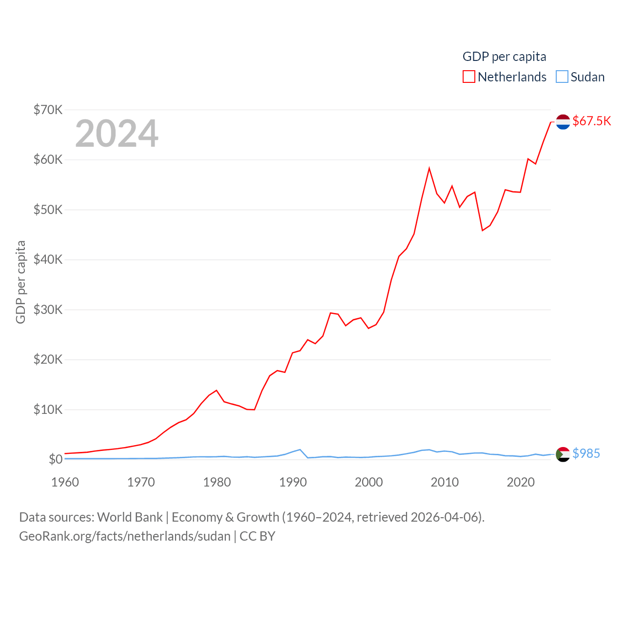 By GDP, The Netherlands ranks 19/197 ($1.21T) and Sudan ranks 94/197 ($49.7B). By GDP per capita, The Netherlands ranks 13/197 ($67,520), while Sudan ranks 179/197 ($985).