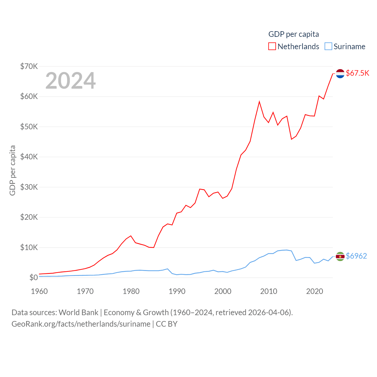 By GDP, The Netherlands ranks 19/197 ($1.21T) and Suriname ranks 164/197 ($4.42B). By GDP per capita, The Netherlands ranks 13/197 ($67,520), while Suriname ranks 102/197 ($6,962).
