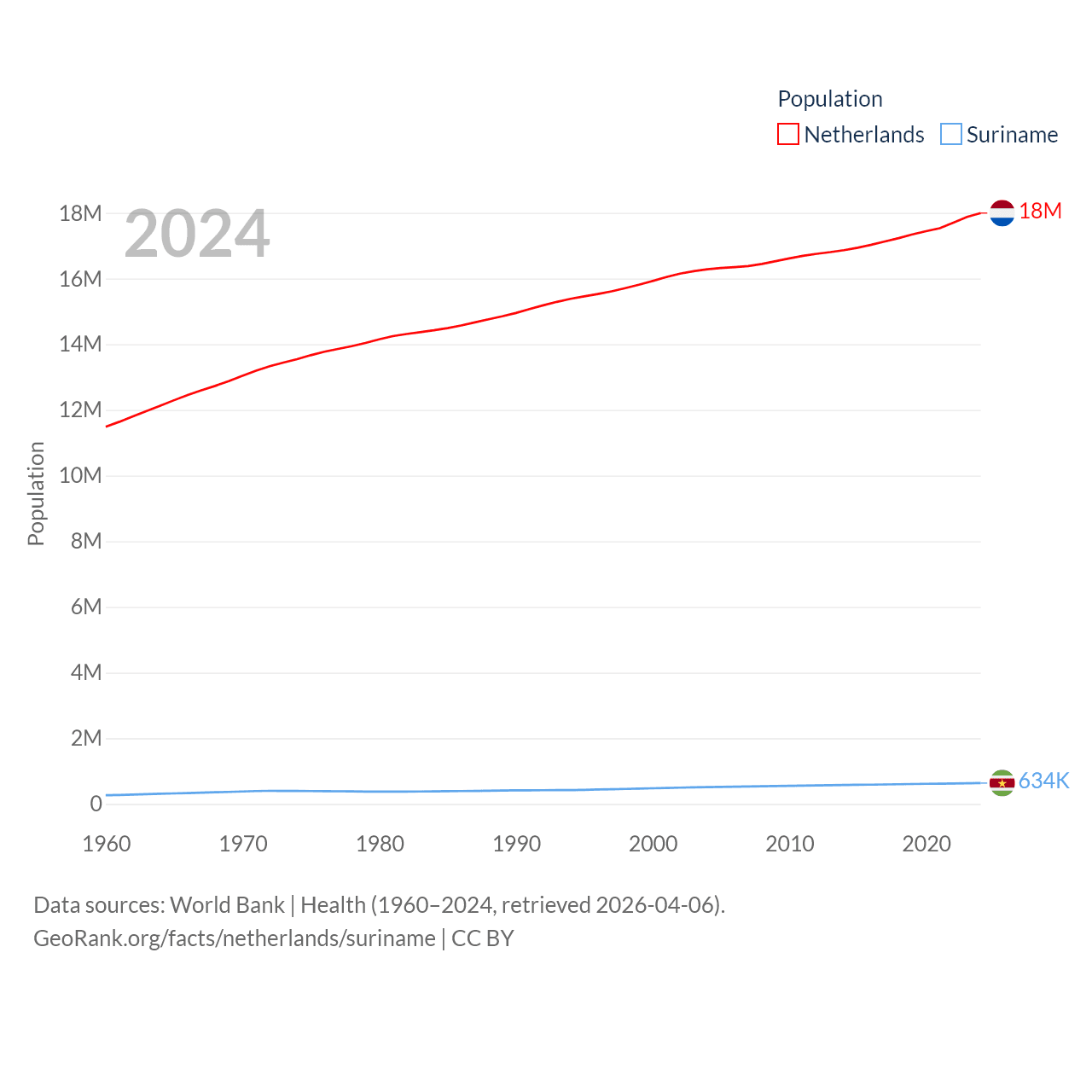 The Netherlands has a population of 18M (ranked 72/197), compared with 634K in Suriname (ranked 165/197). The Netherlands' land area is 13,000 sq mi versus 61,972 sq mi for Suriname (ranked 134th vs. 90th).