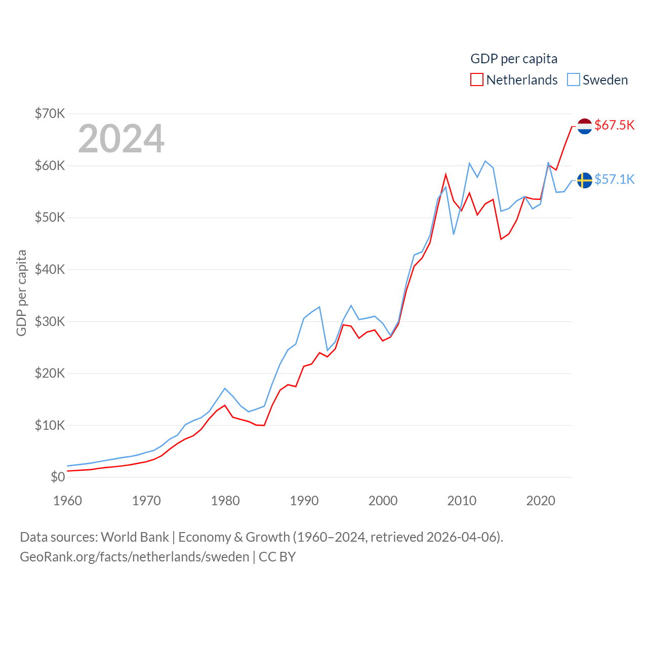 By GDP, The Netherlands ranks 19/197 ($1.21T) and Sweden ranks 26/197 ($604B). By GDP per capita, The Netherlands ranks 13/197 ($67,520), while Sweden ranks 17/197 ($57,117).