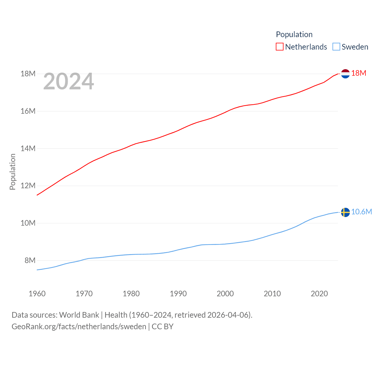 The Netherlands has a population of 18M (ranked 72/197), compared with 10.6M in Sweden (ranked 93/197). The Netherlands' land area is 13,000 sq mi versus 157,248 sq mi for Sweden (ranked 134th vs. 58th).