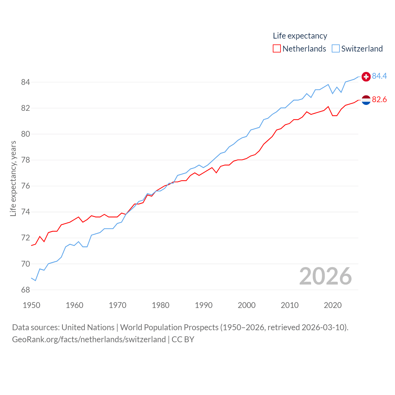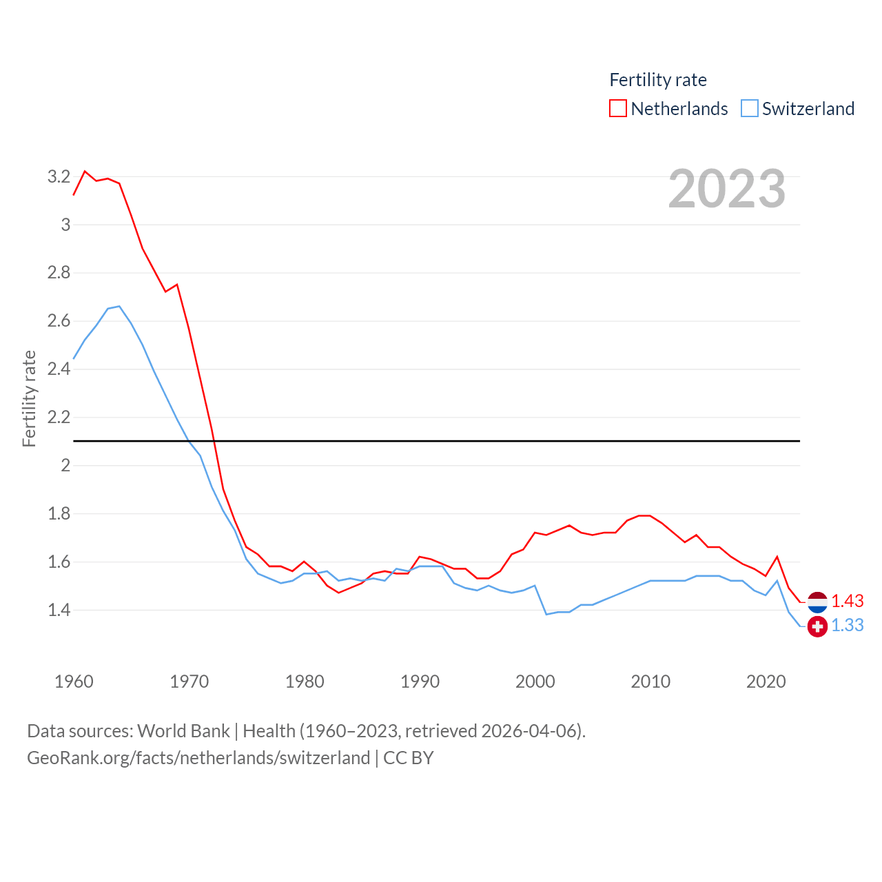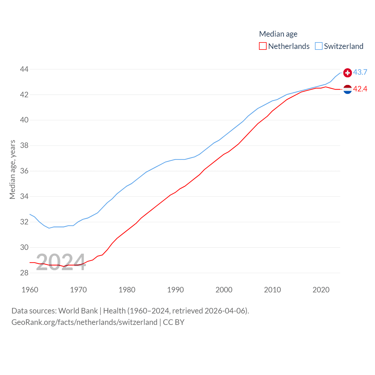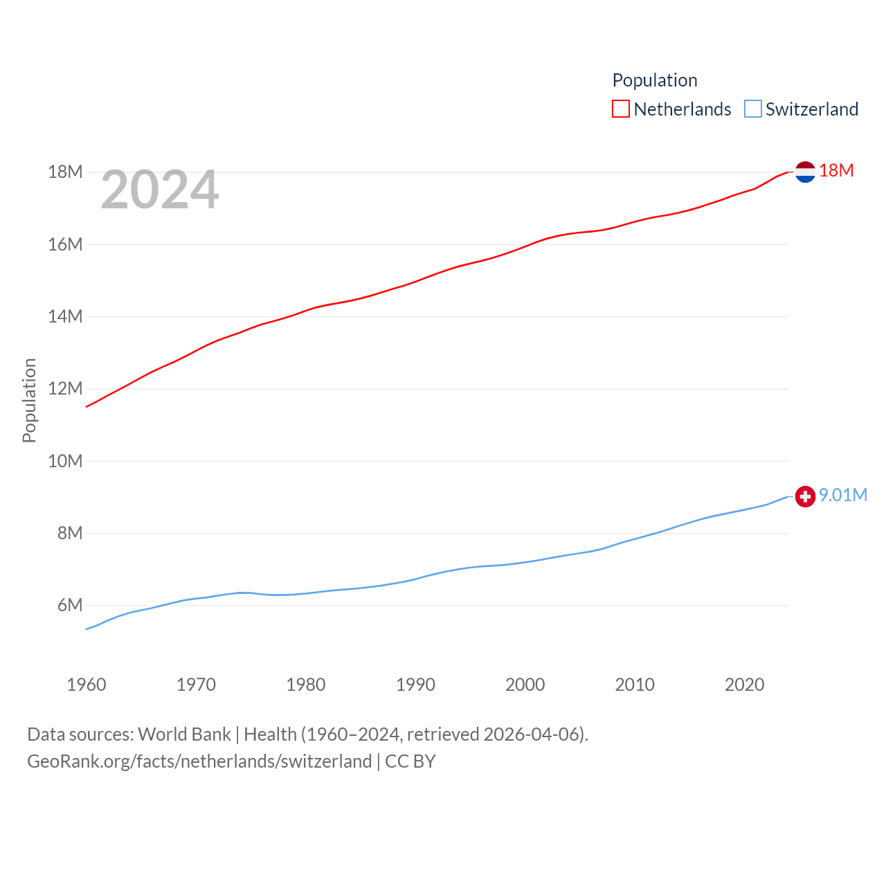 The Netherlands has a population of 18M (ranked 72/197), compared with 9.01M in Switzerland (ranked 101/197). The Netherlands' land area is 13,000 sq mi versus 15,255 sq mi for Switzerland (ranked 134th vs. 131st).