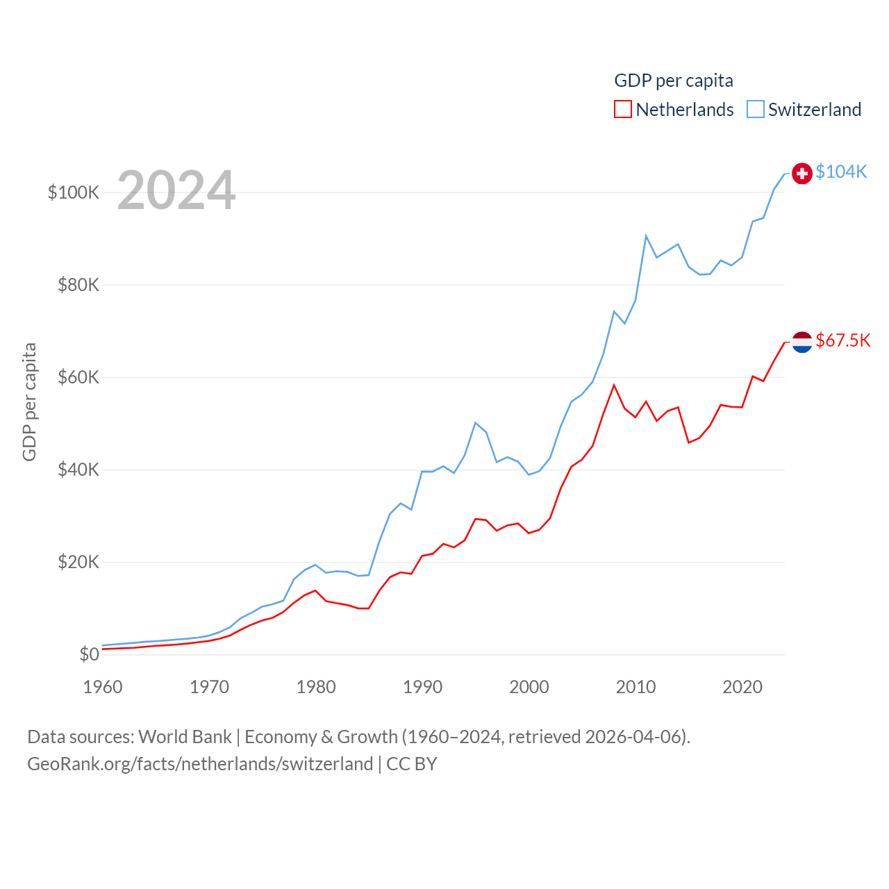 By GDP, The Netherlands ranks 19/197 ($1.21T) and Switzerland ranks 20/197 ($937B). By GDP per capita, The Netherlands ranks 13/197 ($67,520), while Switzerland ranks 5/197 ($103,998).