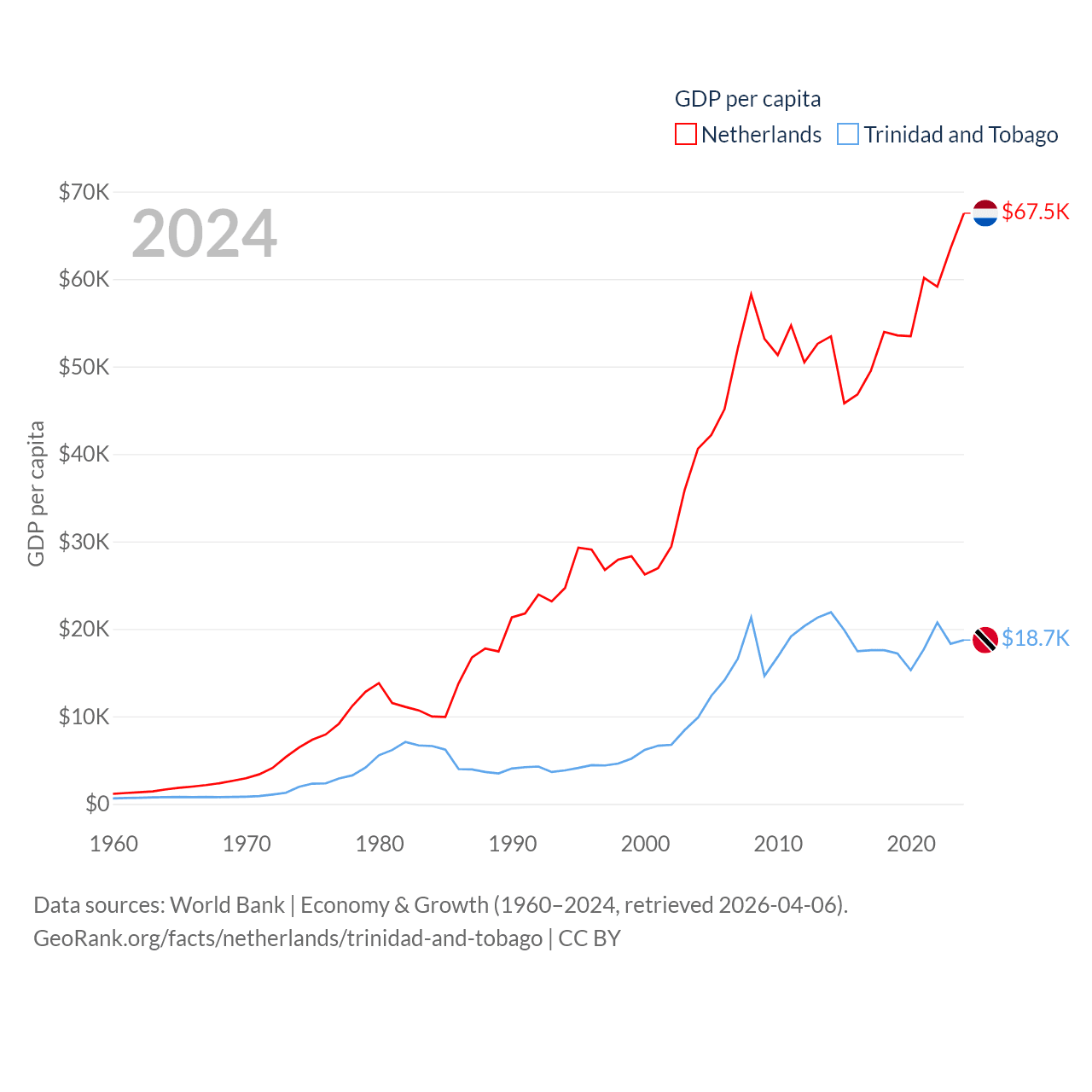 By GDP, The Netherlands ranks 19/197 ($1.21T) and Trinidad and Tobago ranks 115/197 ($25.6B). By GDP per capita, The Netherlands ranks 13/197 ($67,520), while Trinidad and Tobago ranks 61/197 ($18,733).