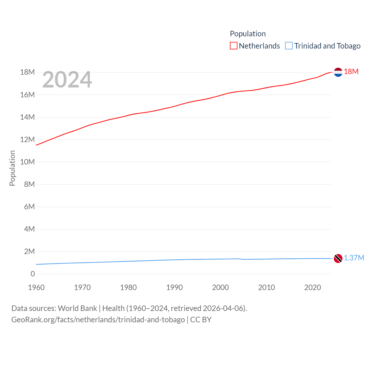 The Netherlands has a population of 18M (ranked 72/197), compared with 1.37M in Trinidad and Tobago (ranked 154/197). The Netherlands' land area is 13,000 sq mi versus 1,981 sq mi for Trinidad and Tobago (ranked 134th vs. 166th).