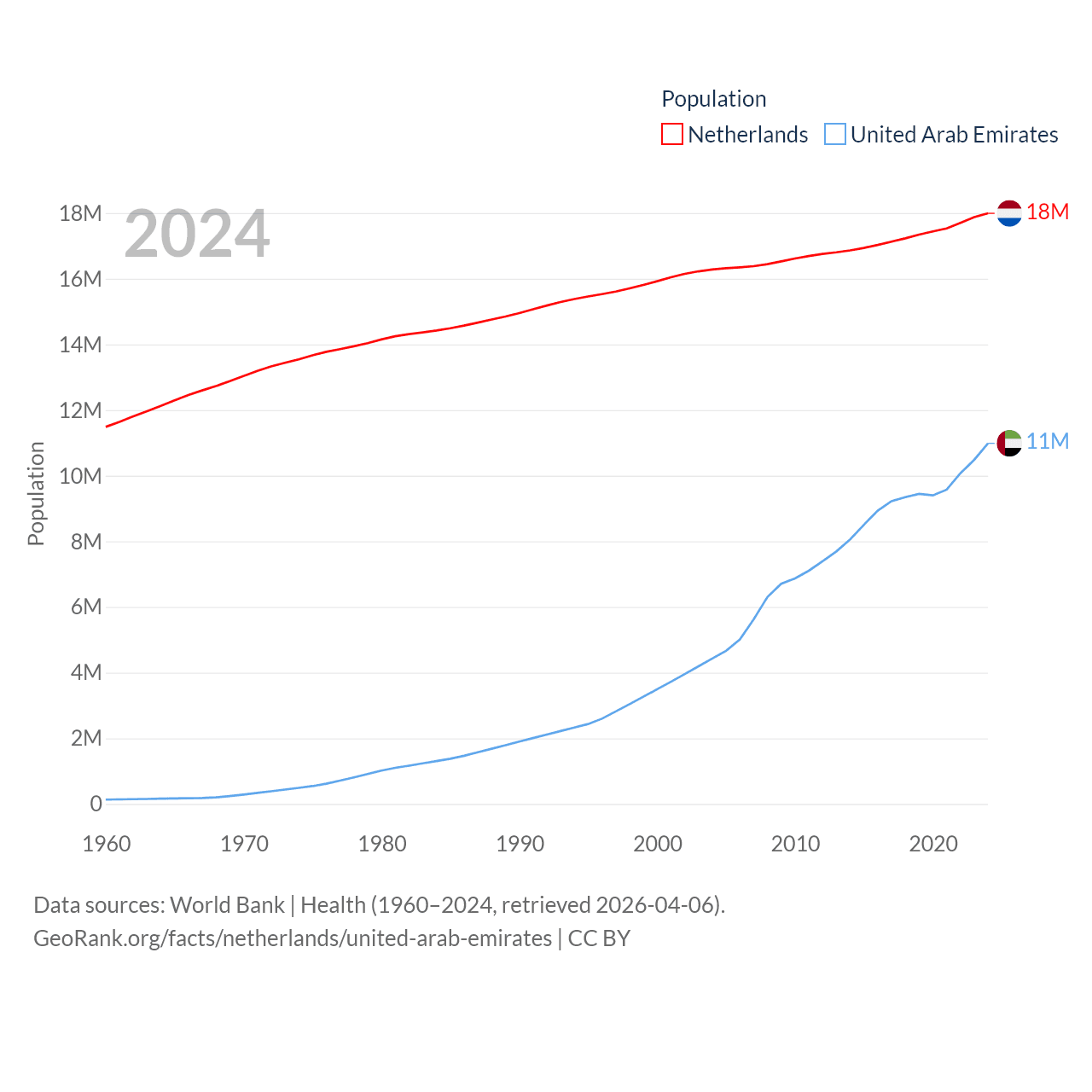 The Netherlands has a population of 18M (ranked 72/197), compared with 11M in The United Arab Emirates (ranked 86/197). The Netherlands' land area is 13,000 sq mi versus 27,421 sq mi for The United Arab Emirates (ranked 134th vs. 117th).