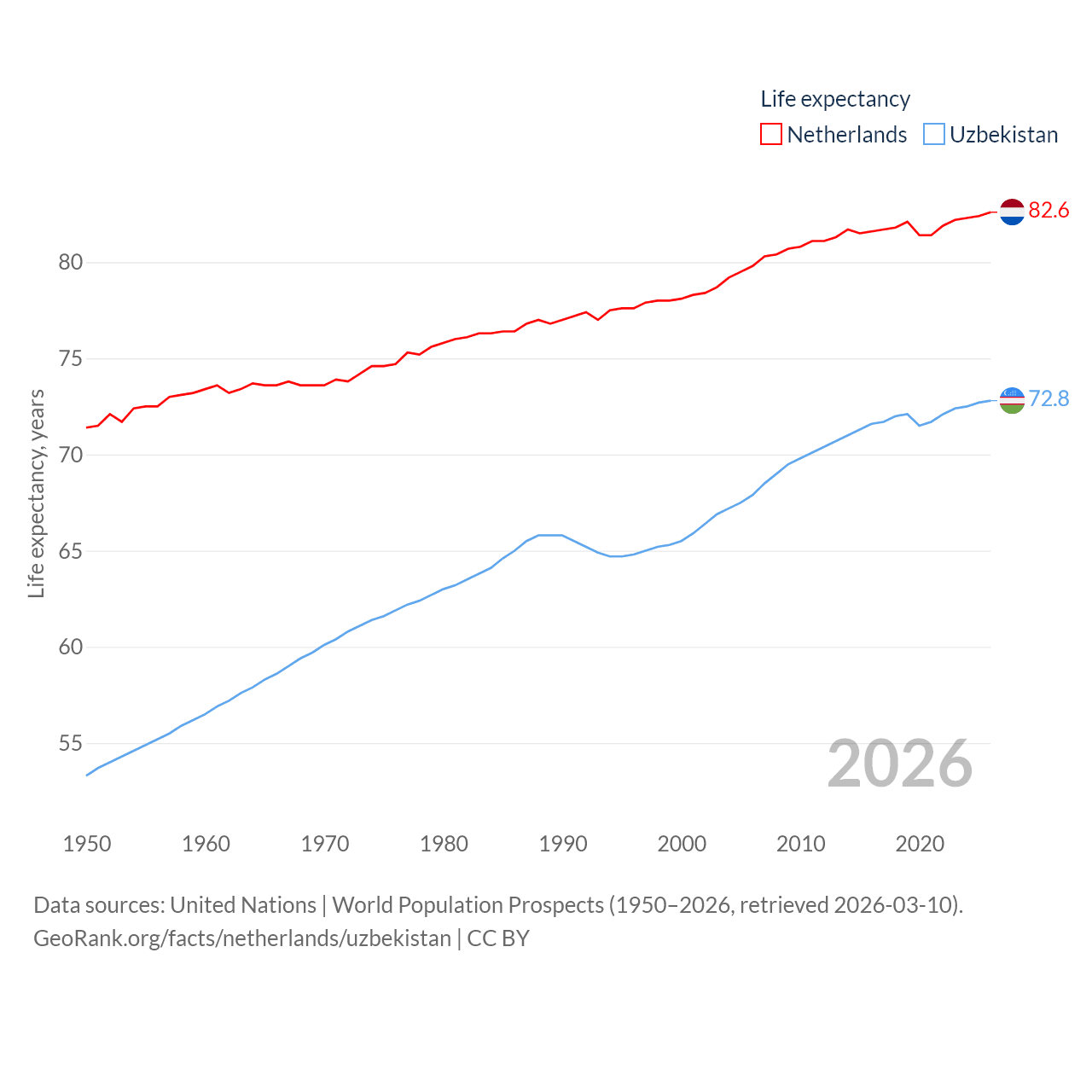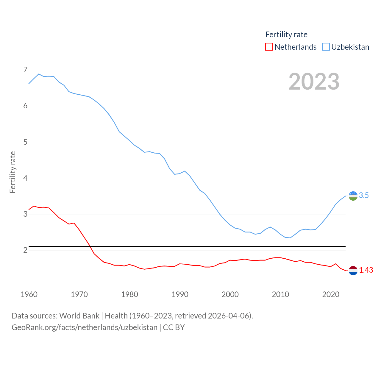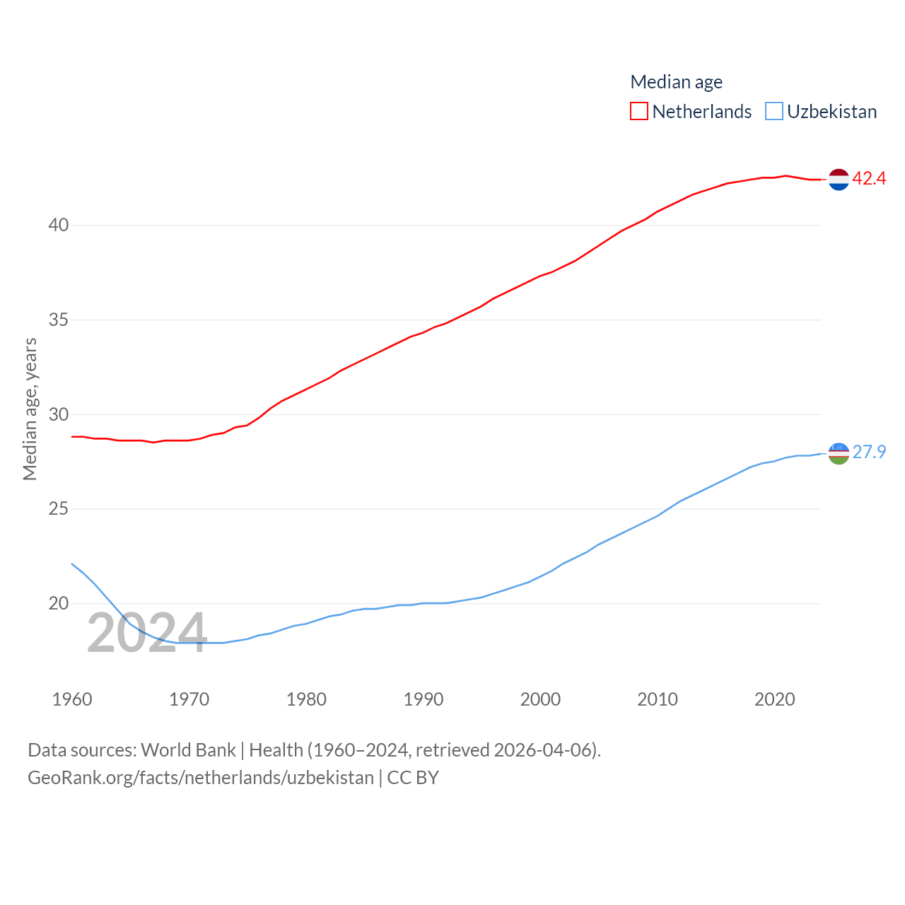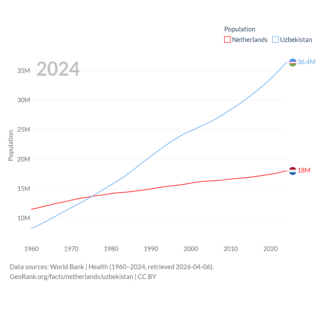 The Netherlands has a population of 18M (ranked 72/197), compared with 36.4M in Uzbekistan (ranked 43/197). The Netherlands' land area is 13,000 sq mi versus 170,136 sq mi for Uzbekistan (ranked 134th vs. 56th).