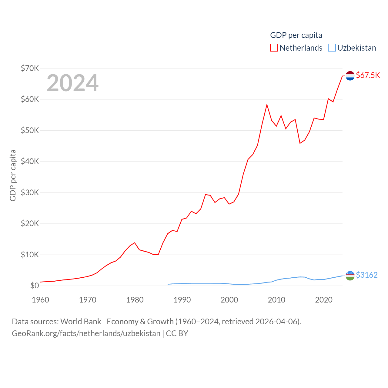 By GDP, The Netherlands ranks 19/197 ($1.21T) and Uzbekistan ranks 66/197 ($115B). By GDP per capita, The Netherlands ranks 13/197 ($67,520), while Uzbekistan ranks 139/197 ($3,162).