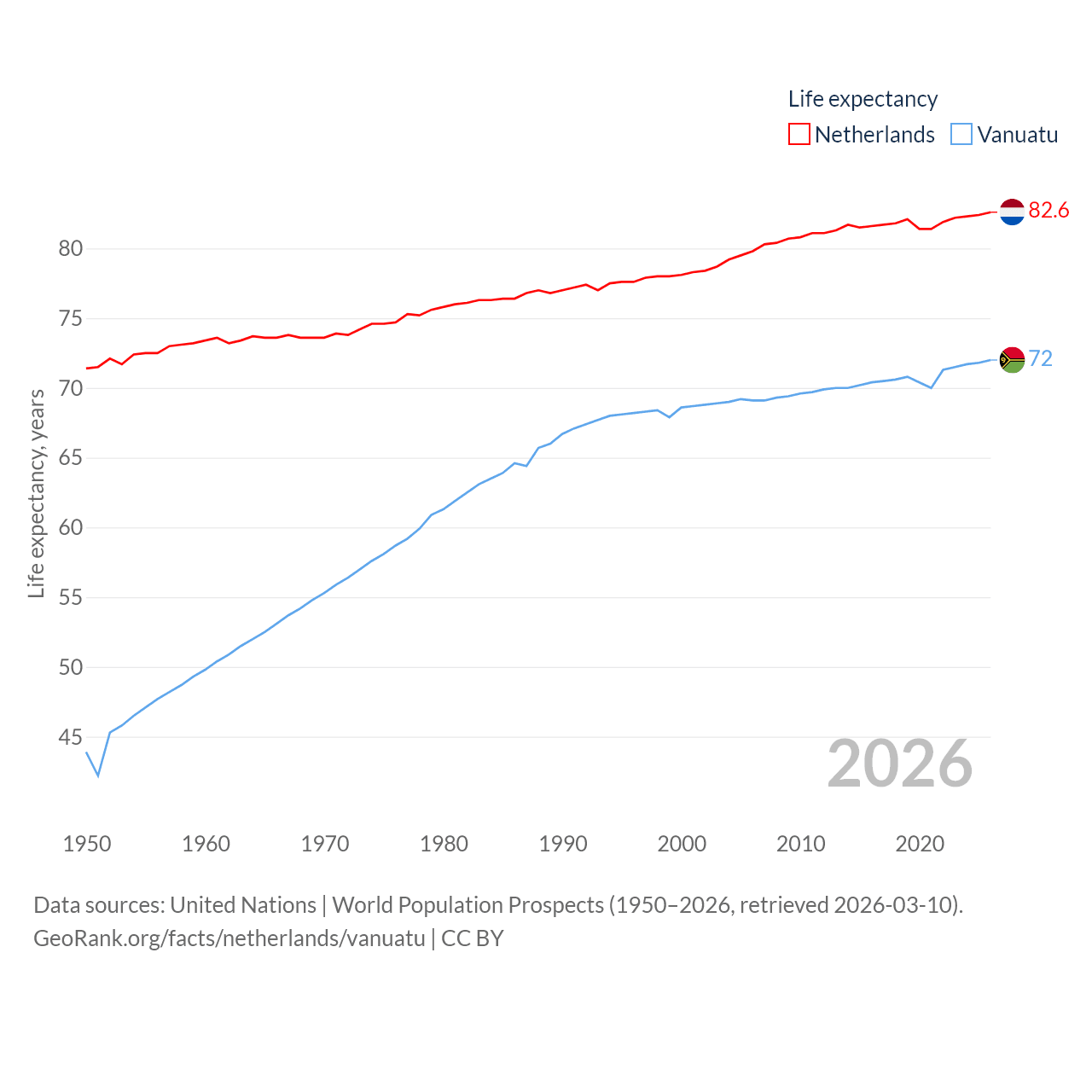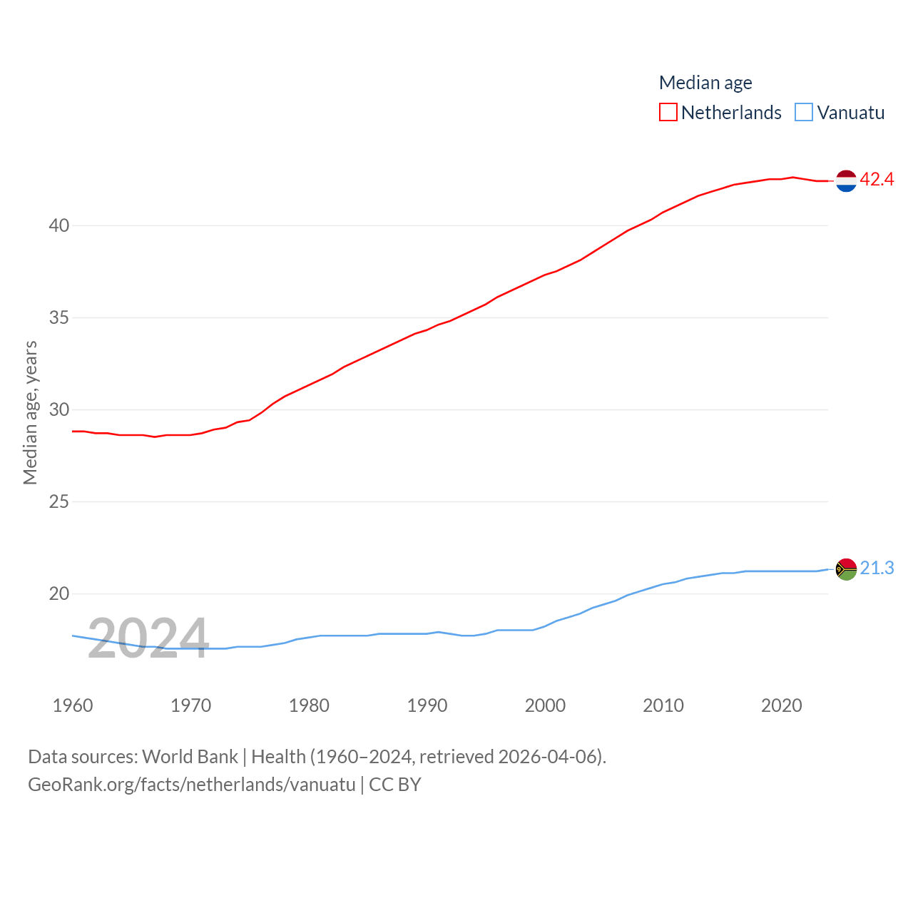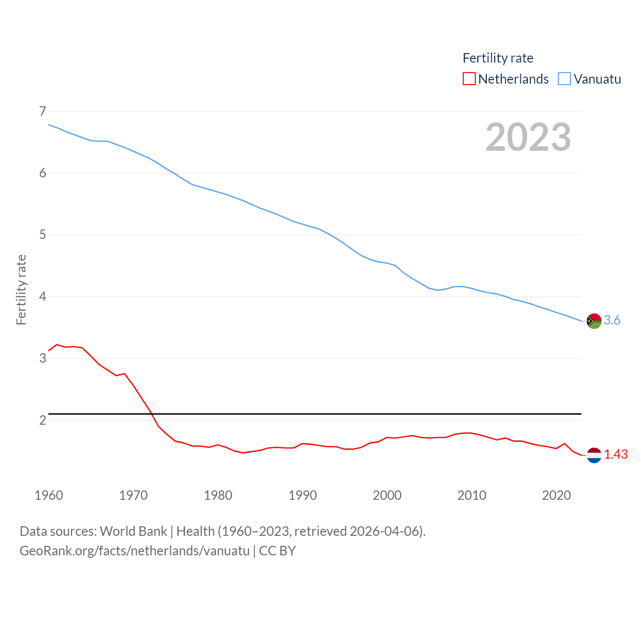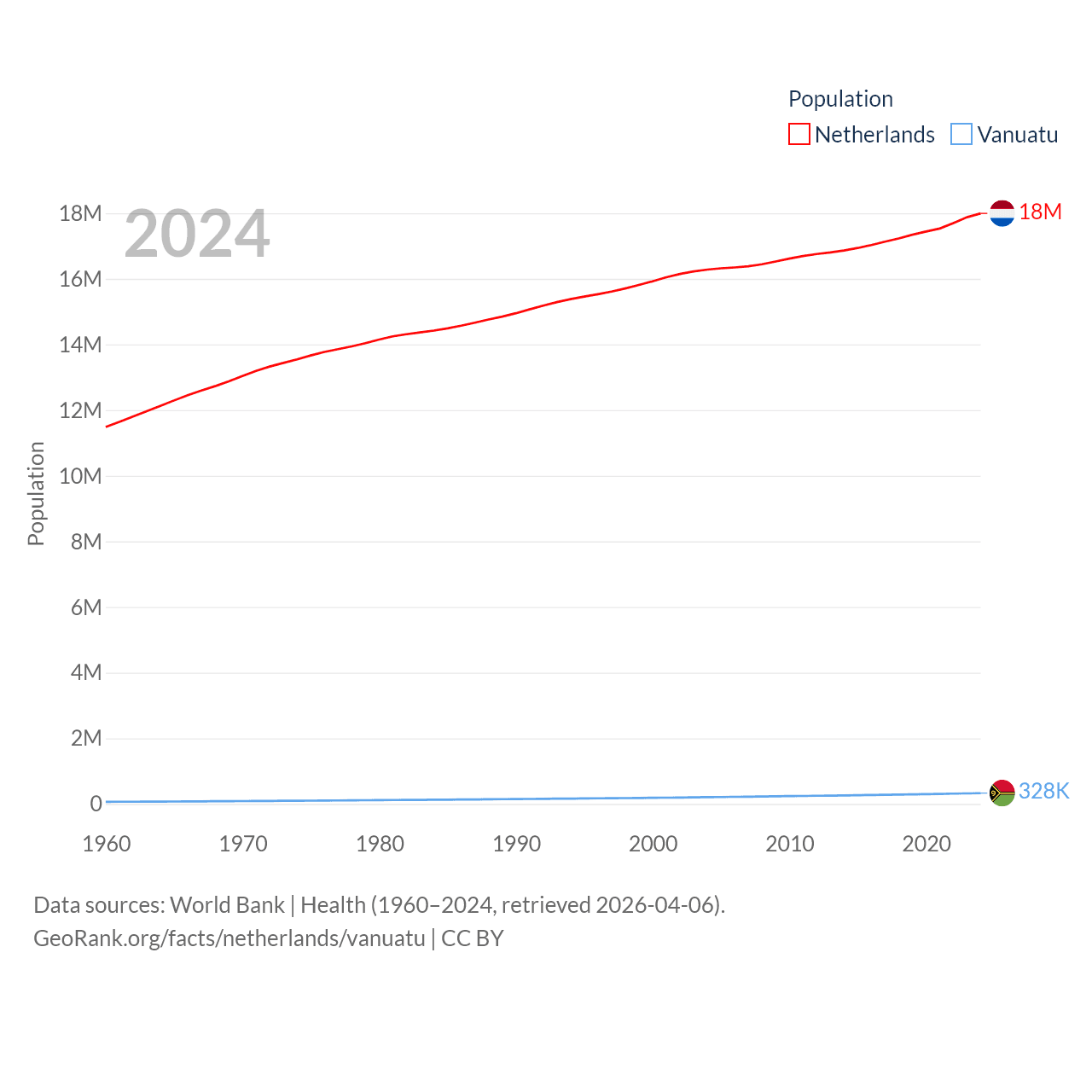 The Netherlands has a population of 18M (ranked 72/197), compared with 328K in Vanuatu (ranked 174/197). The Netherlands' land area is 13,000 sq mi versus 4,707 sq mi for Vanuatu (ranked 134th vs. 157th).