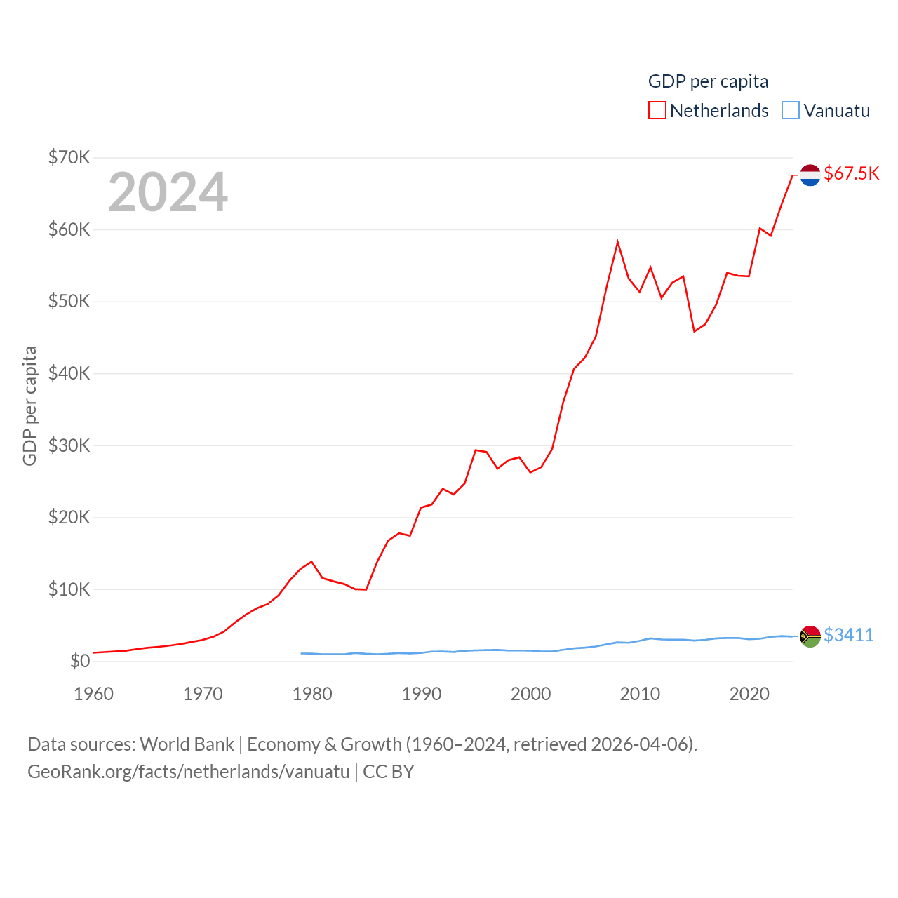 By GDP, The Netherlands ranks 19/197 ($1.21T) and Vanuatu ranks 188/197 ($1.12B). By GDP per capita, The Netherlands ranks 13/197 ($67,520), while Vanuatu ranks 137/197 ($3,411).