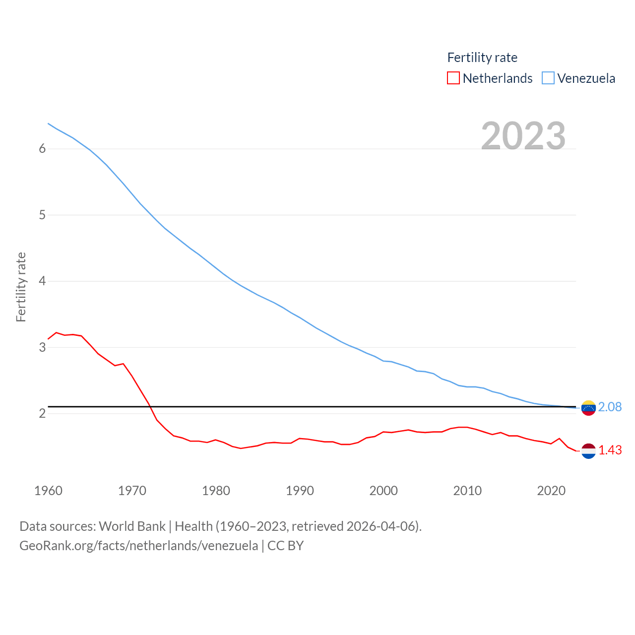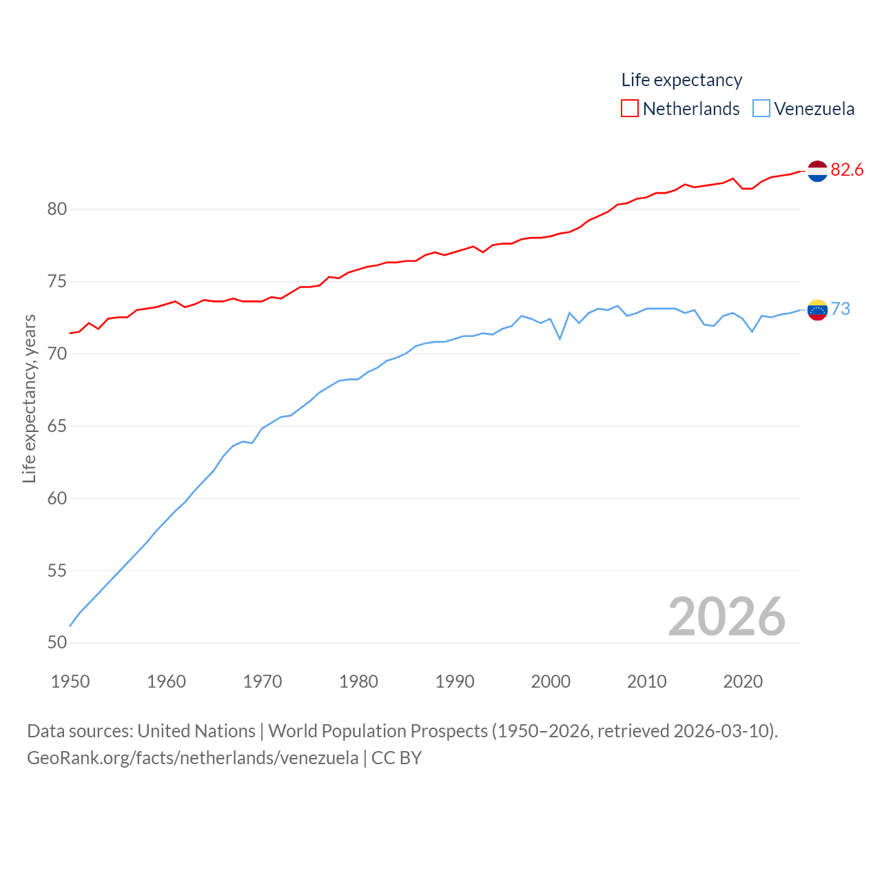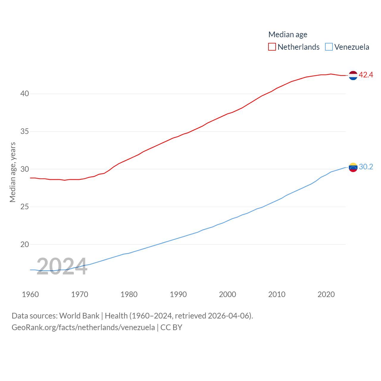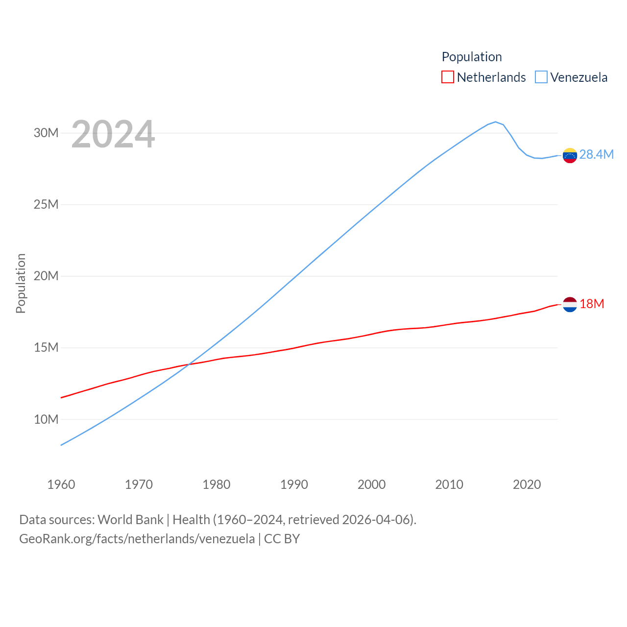 The Netherlands has a population of 18M (ranked 72/197), compared with 28.4M in Venezuela (ranked 53/197). The Netherlands' land area is 13,000 sq mi versus 340,561 sq mi for Venezuela (ranked 134th vs. 32nd).