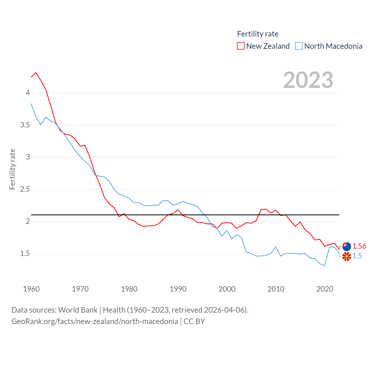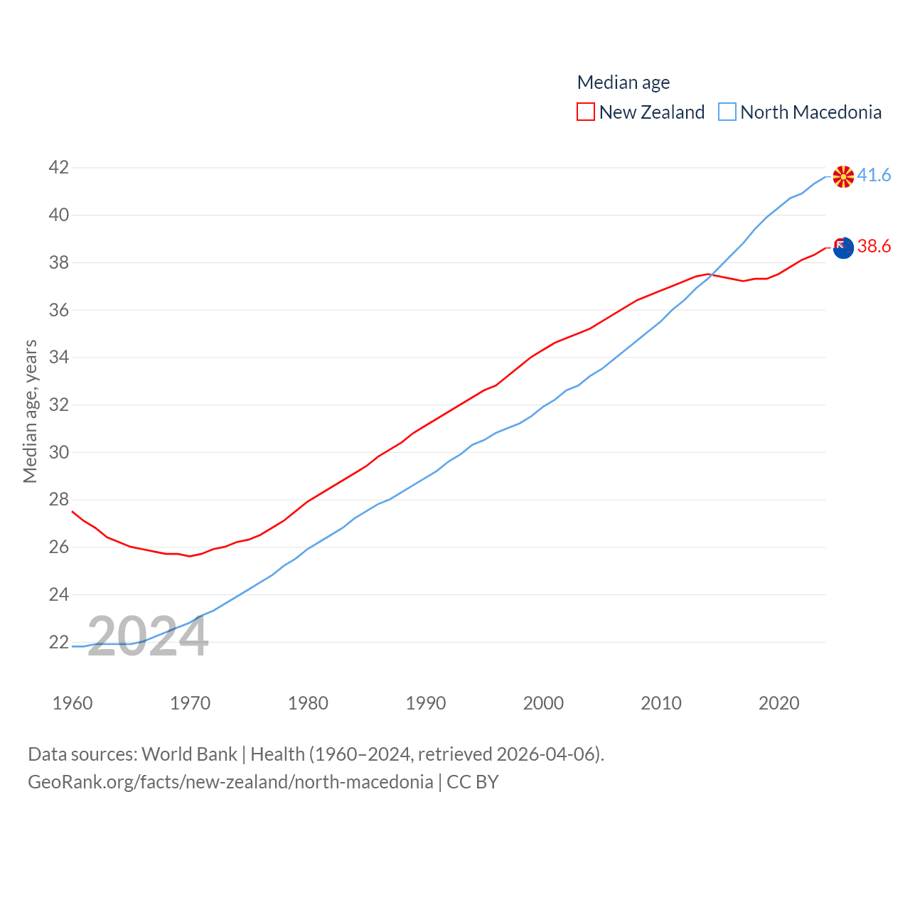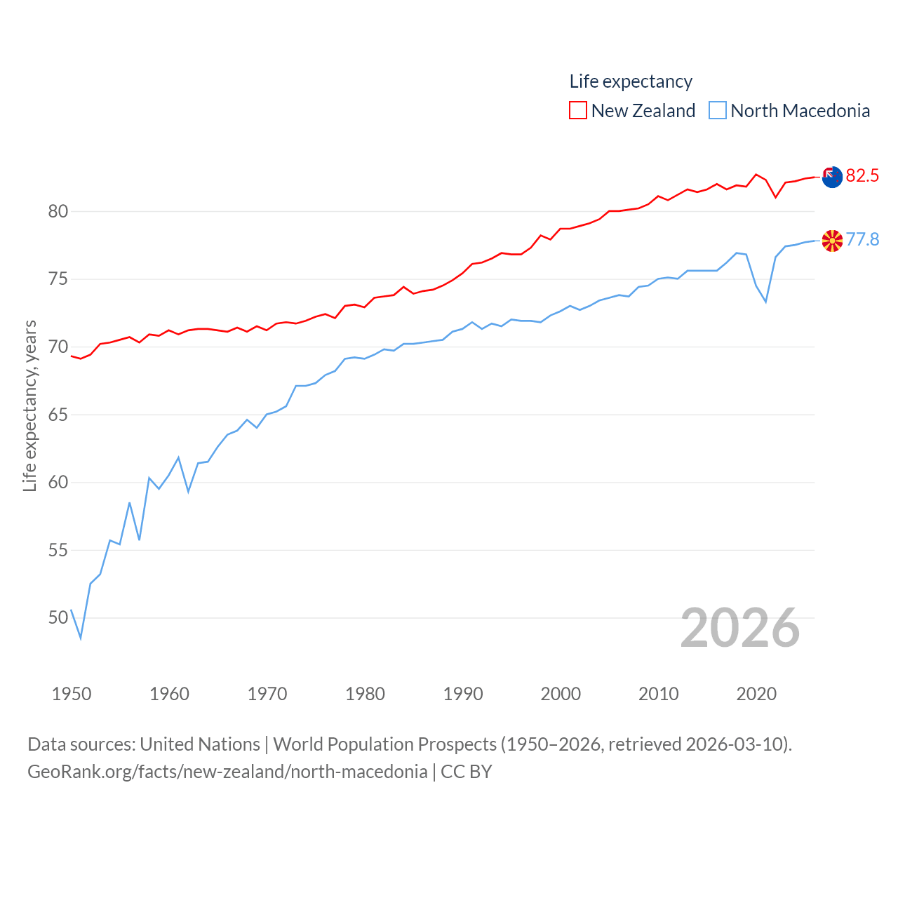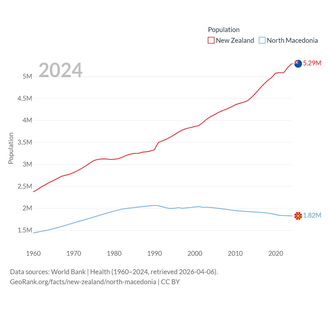 New Zealand has a population of 5.29M (ranked 123/197), compared with 1.82M in North Macedonia (ranked 150/197). New Zealand's land area is 101,665 sq mi versus 9,737 sq mi for North Macedonia (ranked 74th vs. 145th).